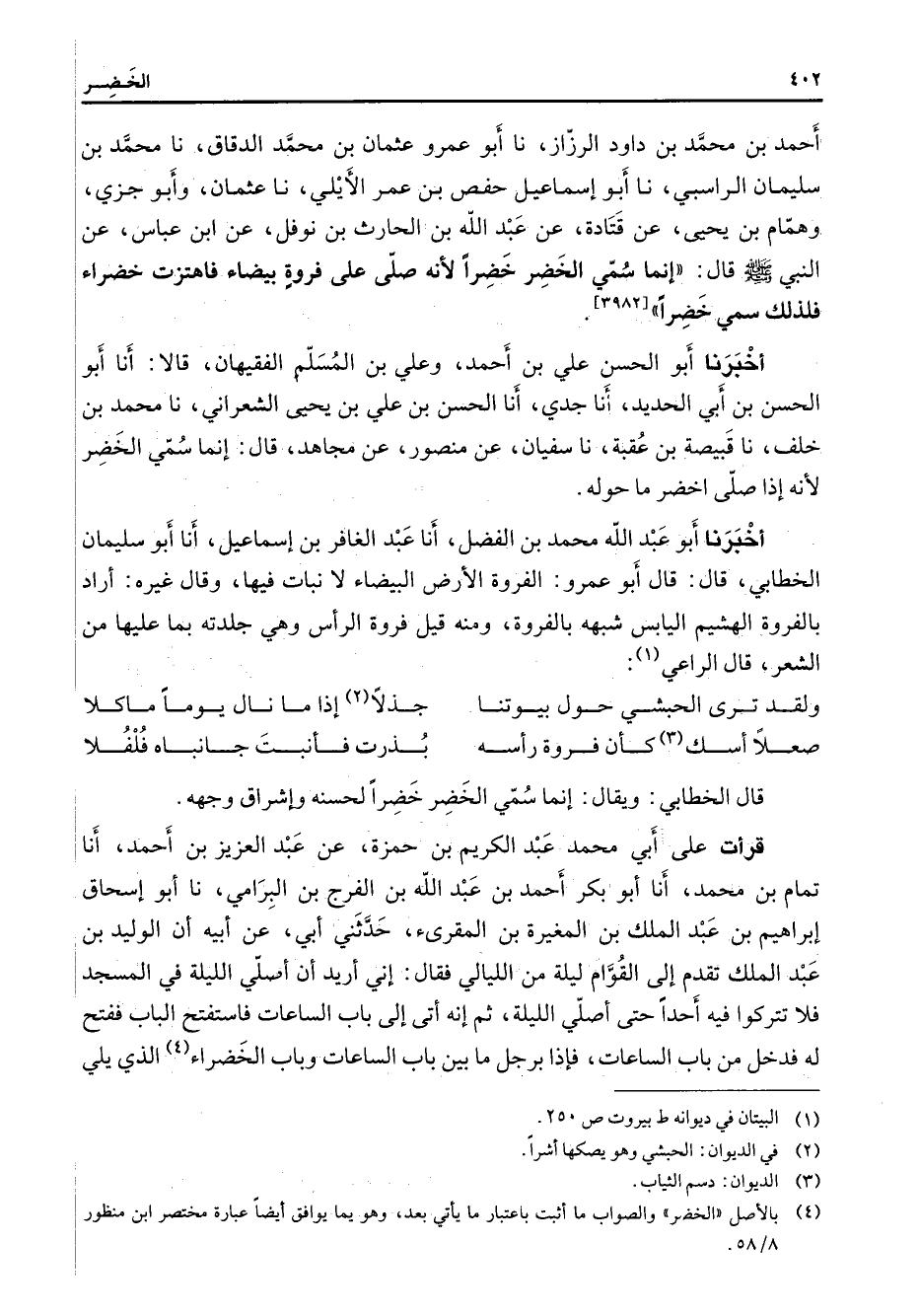 أحمد بن محمد بن داود الرزاز نا أبو عمرو عثمان بن محمد الدقاق نا محمد بن سليمان الراسبي نا أبو إسماعيل حفص بن عمر الأيلي نا عثمان وأبو جزي وهمام بن يحيى عن قتادة عن عبد الله بن الحارث بن نوفل عن ابن عباس عن النبي (صلى الله عليه وسلم) قال إنما سمي الخضر خضرا لأنه صلى على فروة بيضاء فاهتزت خضراء فلذلك سمي خضرا أخبرنا أبو الحسن علي بن أحمد وعلي بن المسلم الفقيهان قالا أنا أبو الحسن بن أبي الحديد أنا جدي أنا الحسن بن علي بن يحيى الشعراني نا محمد بن خلف نا قبيصة بن عقبة نا سفيان عن منصور عن مجاهد قال إنما سمي الخضر لأنه إذا صلى اخضر ما حوله أخبرنا أبو عبد الله محمد بن الفضل أنا عبد الغافر بن إسماعيل أنا أبو سليمان الخطابي قال قال أبو عمرو الفروة الأرض البيضاء لا نبات فيها وقال غيره أراد بالفروة الهشيم اليابس شبهه بالفروة ومنه قيل فروة الرأس وهي جلدته بما عليها من الشعر قال الراعي (1) * ولقد ترى الحبشي حول بيوتنا * جذلا (2) إذا ما نال يوما ماكلا صعلا أسك (3) كأن فروة رأسه * بذرت فأنبت جانباه فلفلا * قال الخطابي ويقال إنما سمي الخضر خضرا لحسنه وإشراق وجهه قرأت على أبي محمد عبد الكريم بن حمزة عن عبد العزيز بن احمد أنا تمام بن محمد أنا أبو بكر أحمد بن عبد الله بن الفرج بن البرامي نا أبو إسحاق إبراهيم بن عبد الملك بن المغيرة بن المقرئ حدثني أبي عن أبيه أن الوليد بن عبد الملك تقدم إلى القوام ليلة من الليالي فقال إني أريد أن أصلي الليلة في المسجد فلا تتركوا فيه أحدا حتى أصلي الليلة ثم إنه أتى إلى باب الساعات فاستفتح الباب ففتح له فدخل من باب الساعات فإذا برجل ما بين باب الساعات وباب الخضراء (4) الذي يلي