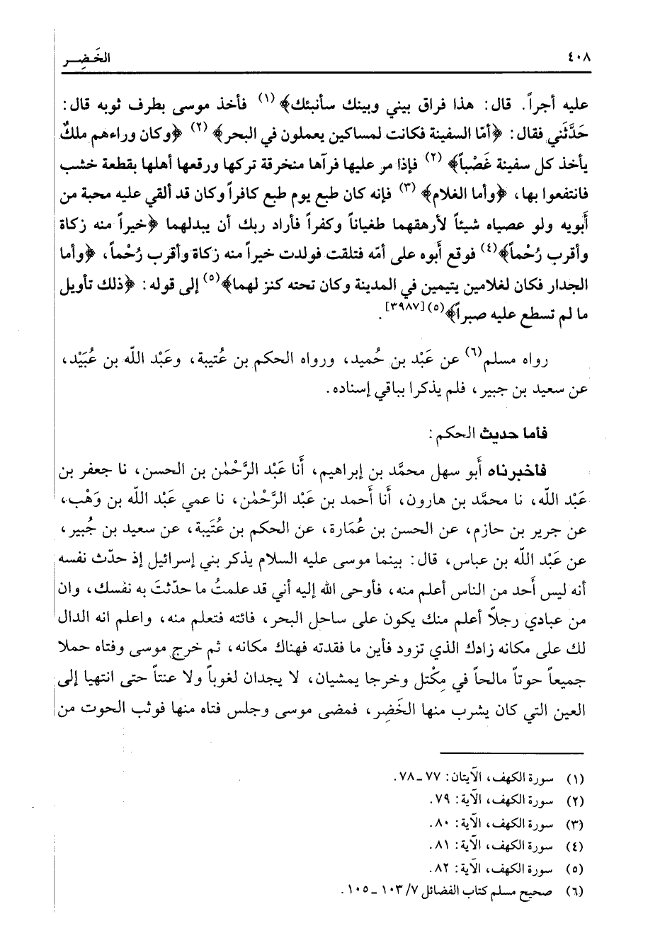 عليه أجرا قال هذا فراق بيني وبينك سأنبئك " (1) فأخذ موسى بطرف ثوبه قال حدثني فقال " أما السفينة فكانت لمساكين يعملون في البحر " (2) " وكان وراءهم ملك يأخذ كل سفينة غصبا (2) " فإذا مر عليها فرآها منخرقة تركها ورقعها أهلها بقطعة خشب فانتفعوا بها " وأما الغلام " (3) فإنه كان طبع يوم طبع كافرا وكان قد ألقي عليه محبة من أبويه ولو عصياه شيئا لأرهقهما طغيانا وكفرا فأراد ربك أن يبدلهما " خيرا منه زكاة وأقرب رحما " (4) فوقع أبوه على أمه فتلقت فولدت خيرا منه زكاة وأقرب رحما " وأما الجدار فكان لغلامين يتيمين في المدينة وكان تحته كنز لهما (5) " إلى قوله " ذلك تأويل ما لم تسطع عليه صبرا " (5) رواه مسلم (6) عن عبد بن حميد ورواه الحكم بن عتيبة وعبد الله بن عبيد عن سعيد بن جبير فلم يذكرا بباقي إسناده فأما حديث الحكم فأخبرناه أبو سهل محمد بن إبراهيم أنا عبد الرحمن بن الحسن نا جعفر بن عبد الله نا محمد بن هارون أنا أحمد بن عبد الرحمن نا عمي عبد الله بن وهب عن جرير بن حازم عن الحسن بن عمارة عن الحكم بن عتيبة عن سعيد بن جبير عن عبد الله بن عباس قال بينما موسى عليه السلام يذكر بني إسرائيل إذ حدث نفسه أنه ليس أحد من الناس أعلم منه فأوحى الله إليه أني قد علمت ما حدثت به نفسك وإن من عبادي رجلا أعلم منك يكون على ساحل البحر فائته فتعلم منه واعلم أنه الدال