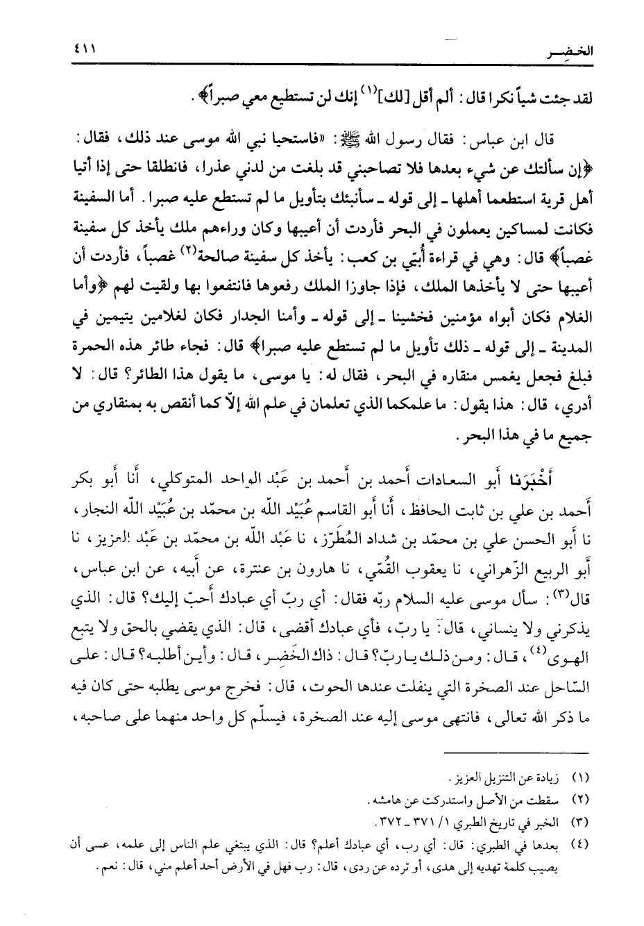 (4) بعدها في الطبري: قال: أي رب أي عبادك أعلم؟ قال: الذي يبتغي علم الناس إلى علمه عسى أن يصيب كلمة تهديه إلى هدى أو ترده عن ردى قال: رب فهل في الارض أحد أعلم مني قال: نعم