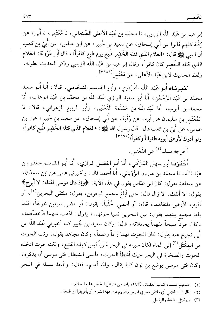 إبراهيم بن عبد الله الزينبي نا محمد بن عبد الأعلى الصنعاني نا معتمر نا أبي عن رقبة كلهم قالوا عن أبي إسحاق عن سعيد بن جبير عن ابن عباس عن أبي بن كعب أن النبي (صلى الله عليه وسلم) قال الغلام الذي قتله الخضر طبع يوم طبع كافرا قال أبو عروبة الغلام الذي قتله الخضر كان كافرا وقال إبراهيم بن عبد الله الزينبي وذكر الحديث بطوله ولفظ الحديث لابن عبد الأعلى عن معتمر أخبرناه أبو عبد الله الفراوي وأبو القاسم الشحامي قالا أنا أبو سعد محمد بن عبد الرحمن أنا أبو سعيد الرازي عبد الله بن محمد بن عبد الوهاب أنا محمد بن أيوب أنا عبد الله بن مسلمة القعنبي وأبو الربيع الزهراني قالا نا المعتمر بن سليمان عن أبيه عن رقبة عن أبي إسحاق عن سعيد بن جبير عن ابن عباس عن أبي بن كعب قال قال رسول الله (صلى الله عليه وسلم) الغلام الذي قتله الخضر طبع كافرا ولو أدرك لأرهق أبويه طغيانا وكفرا أخرجه مسلم (1) عن القعنبي أخبرنا أبو سهل المزكي أنا أبو الفضل الرازي أنا أبو القاسم جعفر بن عبد الله نا محمد بن هاورن الروياني أنا أحمد قال وأخبرني عمي عن ابن سمعان عن مجاهد يقول كان ابن عباس يقول في هذه الآية " وإذ قال موسى لفتاه لا أبرح " يقول لا أنفك لا زال قال حتى أبلغ مجمع البحرين يقول ملتقى البحرين (2) أو أقرب الأرض ملتقاهما قال أو أمضي حقبا يقول أو أمضي سبعين خريفا فلما بلغا مجمع بينهما يقول بين البحرين نسيا حوتهما يقول اذهب منهما فأخطأهما وكان حوتا مليحا مفهما يحملانه قال وكان سعيد بن جبير كما أخبرني عبد الله بن أبي نجيح عنه يقول كان الحوت لهما زادا وعلما وكان مجاهد يقول وثب الحوت من المكتل (3) إلى الماء فكان سبيله في البحر سربا ليس كهذه الفتح ولكنه حوت اتخذه الحوت والصخرة في البحر حيث أخطأ الحوت فأنسى الشيطان فتى موسى أن يذكره وكان فتى موسى يوشع بن نون كما يقال والله أعلم فقال واتخذ سبيله في البحر