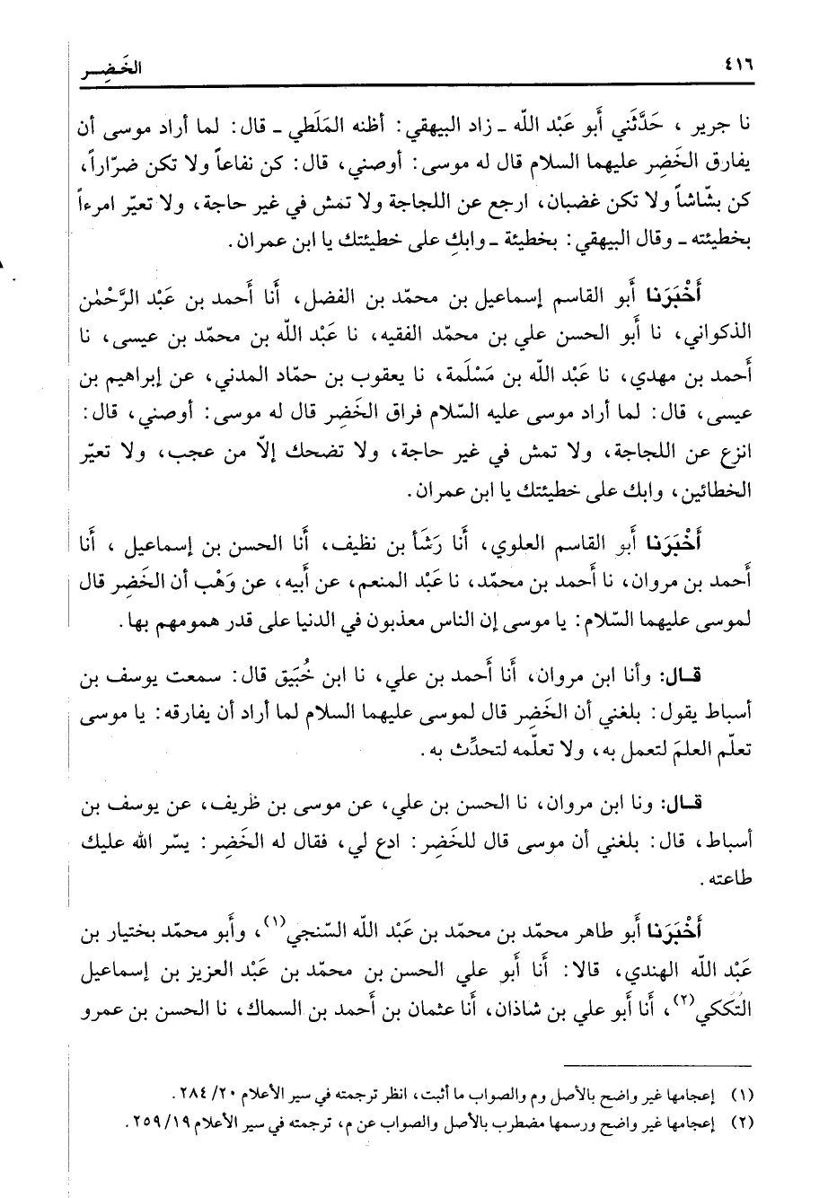 نا جرير حدثني أبو عبد الله زاد البيهقي أظنه الملطي قال لما أراد موسى أن يفارق الخضر عليهما السلام قال له موسى أوصني قال كن نفاعا ولا تكن ضرارا كنت بشاشا ولا تكن غضبان ارجع عن اللجاجة ولا تمش في غير حاجة ولا تعير امرءا بخطيئته وقال البيهقي بخطيئة وابك على خطيئتك يا ابن عمران أخبرنا أبو القاسم إسماعيل بن محمد بن الفضل أنا أحمد بن عبد الرحمن الذكواني نا أبو الحسن علي بن محمد الفقيه نا عبد الله بن محمد بن عيسى نا أحمد بن مهدي نا عبد الله بن مسلمة نا يعقوب بن حماد المدني عن إبراهيم بن عيسى قال لما أراد موسى عليه السلام فراق الخضر قال له موسى أوصني قال انزع عن اللجاجة ولا تمش في غير حاجة ولا تضحك إلا من عجب ولا تعير الخطائين وابك على خطيئتك يا ابن عمران أخبرنا أبو القاسم العلوي أنا رشأ بن نظيف أنا الحسن بن إسماعيل أنا أحمد بن مروان نا أحمد بن محمد نا عبد المنعم عن أبيه عن وهب أن الخضر قال لموسى عليهما السلام يا موسى إن الناس معذبون في الدنيا على قدر همومهم بها قال وأنا ابن مروان أنا أحمد بن علي نا ابن خبيق قال سمعت يوسف بن أسباط يقول بلغني أن الخضر قال لموسى عليهما السلام لما أراد أن يفارقه يا موسى تعلم العلم لتعمل به ولا تعلمه لتحدث به قال ونا ابن مروان نا الحسن بن علي عن موسى بن ظريف عن يوسف بن أسباط قال بلغني أن موسى قال للخضر ادع لي فقال له الخضر يسر الله عليك طاعته أخبرنا أبو طاهر محمد بن محمد بن عبد الله السنجي (1) وأبو محمد بختيار بن عبد الله الهندي قالا أنا أبو علي الحسن بن محمد بن عبد العزيز بن إسماعيل التككي (2) أنا أبو علي بن شاذان أنا عثمان بن أحمد بن السماك نا الحسن بن عمرو