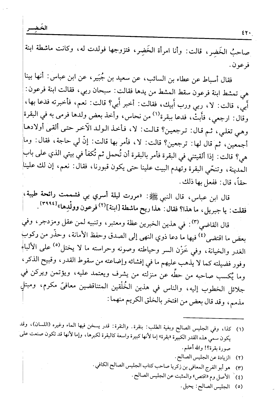 صاحب الخضر قالت وأنا امرأة الخضر فتزوجها فولدت له وكانت ماشطة ابنة فرعون فقال أسباط عن عطاء بن السائب عن سعيد بن جبير عن ابن عباس أنها بينا هي تمشط ابنة فرعون سقط المشط من يدها فقالت سبحان ربي فقالت ابنة فرعون أبي قالت لا ربي ورب أبيك فقالت أخبر أبي قالت نعم فأخبرته فدعا بها وقال ارجعي فأبت فدعا ببقرة (1) من نحاس وأخذ بعض ولدها فرمى به في البقرة وهي تغلي ثم قال ترجعين قالت لا فأخذ الولد الآخر حتى ألقى أولادها أجمعين ثم قال لها ترجعين قالت لا فأمر بها قالت إن لي حاجة فقال وما هي قالت إذا ألقيتني في البقرة فأمر بالبقرة أن تحمل ثم تكفأ في بيتي الذي على باب المدينة وتنحي البقرة وتهدم البيت علينا حتى يكون قبورنا فقال نعم إن لك علينا حقا قال ففعل بها ذلك قال ابن عباس قال النبي (صلى الله عليه وسلم) مررت ليلة أسري بي فشممت رائحة طيبة فقلت يا جبريل ما هذا فقال هذا ريح ماشطة ابنة (2) فرعون وولدها قال القاضي (3) في هذين الخبرين عظة ومعتبر وتنبيه لمن عقل ومزدجر وفي بعض ما اقتضى (4) فيها ما دعا ذوي النهى إلى الصدق وحفظ الأمانة وحذر من ركوب الغدر والخيانة وفي خزن السر وحياطته وصونه وحراسته ما لا يختل (5) على الألباء وفور فضيلته كما لا يذهب عليهم ما في إفشائه وإضاعته من سقوط القدر وقبيح الذكر وما يكسب صاحبه من حطه عن منزلته من يشرف ويعتمد عليه ويؤتمن ويركن في جلائل الخطوب إليه والناس في هذين الخلقين المتناقضين معافى مكرم ومبتل مذمم وقد قال بعض من افتخر بالخلق الكريم منهما