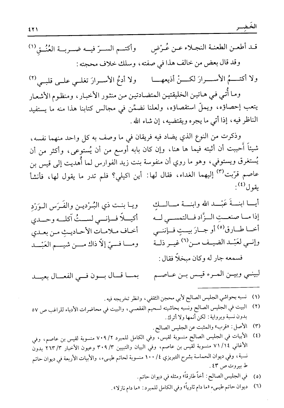 (4) الابيات في الجليس الصالح منسوبة لقيس وفي الكامل للمبرد 2 / 709 منسوبة لقيس بن عاصم وفي الاغاني 14 / 71 منسوبة لقيس بن عاصم وفي البيان والتبيين 3 / 309 وعيون الاخبار 3 / 263 بدون نسبة وفي ديوان الحماسة بشرح التبريزي 4 / 100 منسوبة لحاتم طيئ والابيات الاربعة في ديوان حاتم ط بيروت ص 43