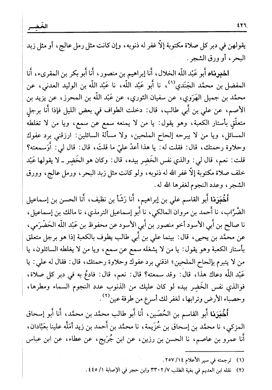 يقولهن في دبر كل صلاة مكتوبة إلا غفر له ذنوبه وإن كانت مثل رمل عالج أو مثل زبد البحر أو ورق الشجر أخبرناه أبو عبد الله الخلال أنا إبراهيم بن منصور أنا أبو بكر بن المقرئ أنا المفضل بن محمد الجندي (1) نا أبو عبد الله نا عبد الله بن الوليد العدني عن محمد بن جميل الهروي عن سفيان الثوري عن عبد الله بن المحرز عن يزيد بن الأصم عن علي بن أبي طالب قال دخلت الطواف في بعض الليل فإذا أنا برجل متعلق بأستار الكعبة وهو يقول يا من لا يمنعه سمع عن سمع ويامن لا تغلطه المسائل ويا من لا يبرحه إلحاح الملحين ولا مسألة السائلين ارزقني برد عفوك وحلاوة رحمتك قال فقلت له يا هذا أعد علي ما قلت قال قال لي أو سمعته قلت نعم قال لي والذي نفس الخضر بيده قال وكان هو الخضر لا يقولها عبد خلف صلاة مكتوبة إلا غفر الله له ذنوبه ولو كانت مثل زبد البحر ورمل عالج وورق الشجر وعدد النجوم لغفرها الله له أخبرنا أبو القاسم علي بن إبراهيم أنا رشأ بن نظيف أنا الحسن بن إسماعيل الضراب نا أحمد بن مروان المالكي نا أبو إسماعيل الترمذي نا مالك بن إسماعيل نا صالح بن أبي الأسود أخو منصور بن أبي الأسود عن محفوظ بن عبد الله الحضرمي عن محمد بن يحيى قال بينما علي بن أبي طالب يطوف بالكعبة إذا هو برجل متعلق بأستار الكعبة وهو يقول يا من لا يشغله سمع عن سمع ويا من لا يغلطه السائلون يا من لا يتبرم بإلحاح الملحين اذقني برد عفوك وحلاوة رحمتك قال فقال له علي يا عبد الله دعاك هذا قال وقد سمعته قال نعم قال فادع به في دبر كل صلاة فوالذي نفس الخضر بيده لو كان عليك من الذنوب عدد النجوم السماء ومطرها وحصباء الأرض وترابها لغفر لك أسرع من طرفة عين (2) أخبرنا أبو القاسم بن الحصين أنا أبو طالب محمد بن محمد أنا أبو إسحاق المزكي نا محمد بن إسحاق بن خزيمة نا محمد بن أحمد بن زيد أمله علينا بعبادان أنا عمرو بن عاصم نا الحسن بن رزين عن ابن جريج عن عطاء عن ابن عباس