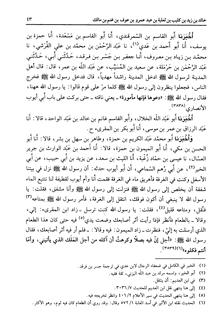أخبرنا أبو القاسم بن السمرقندي أنا أبو القاسم بن مسعدة أنا حمزة بن يوسف أنا أنا أبو أحمد بن عدي (1) نا عبد الرحمن بن محمد بن علي القرشي نا محمد بن زياد بن معروف أنا جعفر بن جسر بن فرقد حدثني أبي حدثني عبد الرحمن بن حرملة عن سعيد بن المسيب عن عبد الله بن عمر قال قال أهل المدينة لرسول الله (صلى الله عليه وسلم) ادخل المدينة راشدا مهديا قال فدخل رسول الله (صلى الله عليه وسلم) فخرج الناس فجعلوا ينظرون إلى رسول الله (صلى الله عليه وسلم) كلما مر على قوم قالوا يا رسول الله ههنا فقال رسول الله (صلى الله عليه وسلم) دعوها فإنها مأمورة يعني ناقته حتى بركت على باب أبي أيوب الأنصاري أخبرنا أبو عبد الله الخلال وأبو القاسم غانم بن خالد بن عبد الواحد قالا أنا عبد الرزاق بن عمر بن موسى أنا أبو بكر بن المقرئ وأخبرنا أبو محمد عبد الكريم بن حمزة وطاهر بن سهل بن بشر قالا أنا أبو الحسن بن مكي أنا أبو الميمون بن حمزة قالا أنا أحمد بن عبد الوارث بن جرير العسال نا عيسى بن حماد زغبة أنا الليث بن سعد عن يزيد بن أبي حبيب عن أبي الخير (2) عن أبي رهم السماعي أن أبو أيوب حدثه أن رسول الله (صلى الله عليه وسلم) نزل في بيتنا الأسفل وكنت في الغرفة فأهريق ماء في الغرفة فقمت أنا وأم أيوب لقطيفة لنا نتتبع الماء شفقة أن يخلص إلى رسول الله (صلى الله عليه وسلم) فنزلت إلى رسول الله (صلى الله عليه وسلم) وأنا مشفق فقلت يا رسول الله لا ينبغي أن أكون فوقك انتقل إلى الغرفة فأمر رسول الله (صلى الله عليه وسلم) بمتاعه (3) فنقل ومتاعه قليل (4) فقلت يا رسول الله كنت ترسل زاد ابن المقرئ إلي وقالا بالطعام فأنظر فإذا رأيت أثر أصابعك وضعت يدي (5) فيه حتى كان هذا الطعام الذي أرسلت به إلي فنظرت زاد الميمون فيه وقالا فلم أر فيه أثر أصابعك فقال رسول الله (صلى الله عليه وسلم) أجل إن فيه بصلا وكرهت أن آكله من أجل الملك الذي يأتيني وأما أنتم فكلوه (6)