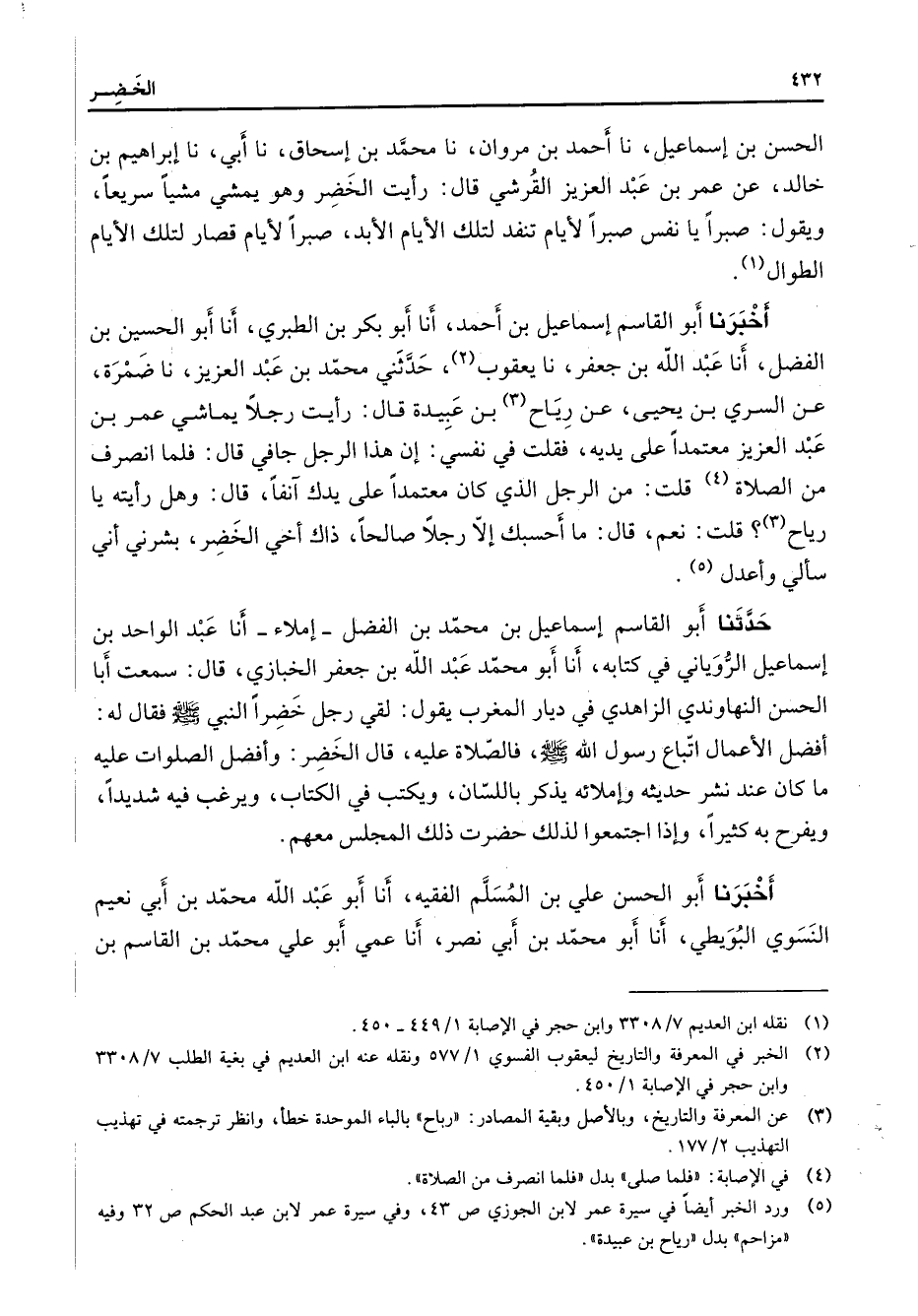 الحسن بن إسماعيل نا أحمد بن مروان نا محمد بن إسحاق نا أبي نا إبراهيم بن خالد عن عمر بن عبد العزيز القرشي قال رأيت الخضر وهو يمشي مشيا سريعا ويقول صبرا يا نفس صبرا لأيام تنفد لتلك الأيام الأبد صبرا لأيام قصار لتلك الأيام الطوال (1) أخبرنا أبو القاسم إسماعيل بن أحمد أنا أبو بكر بن الطبري أنا أبو الحسين بن الفضل أنا عبد الله بن جعفر نا يعقوب (2) حدثني محمد بن عبد العزيز نا ضمرة عن السري بن يحيى عن رياح (3) بن عبيدة قال رأيت رجلا يماشي عمر بن عبد العزيز معتمدا على يديه فقلت في نفسي إن هذا الرجل جافي قال فلما انصرف من الصلاة (4) قلت من الرجل الذي كان معتمدا على يدك آنفا قال وهل رأيته يا رياح (3) قلت نعم قال ما أحسبك إلا رجلا صالحا ذاك أخي الخضر بشرني أني سألي وأعدل (5) حدثنا أبو القاسم إسماعيل بن محمد بن الفضل إملاء أنا عبد الواحد بن إسماعيل الروياني في كتابه أنا أبو محمد عبد الله بن جعفر الخبازي قال سمعت أبا الحسن النهاوندي الزاهدي في ديار المغرب يقول لقي رجل خضرا النبي (صلى الله عليه وسلم) فقال له أفضل الأعمال اتباع رسول الله (صلى الله عليه وسلم) فالصلاة عليه قال الخضر وأفضل الصلوات عليه ما كان عند نشر حديثه وإملائه يذكر باللسان ويكتب في الكتاب ويرغب فيه شديدا ويفرح به كثيرا وإذا اجتمعوا لذلك حضرت ذلك المجلس معهم أخبرنا أبو الحسن علي بن المسلم الفقيه أنا أبو عبد الله محمد بن أبي نعيم النسوي البويطي أنا أبو محمد بن أبي نصر أنا عمي أبو علي محمد بن القاسم بن