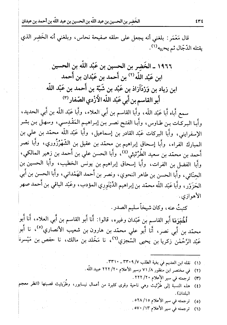 1966 - الخضر بن الحسين بن عبد الله بن الحسين ابن عبد الله (2) بن أحمد بن عبدان بن أحمد ابن زياد بن وردآزاذ بن عبد بن شبة بن أحمد بن عبد الله أبو القاسم بن أبي عبد الله الأزدي الصفار (3) سمع أباه أبا عبد الله وأبا القاسم بن أبي العلاء وأبا عبد الله بن أبي الحديد وأبا البركات بن طاوس وأبا الفتح نصر بن إبراهيم المقدسي وسهل بن بشر الإسفرايني وأبا البركات عبد القادر بن إسماعيل وأبا عبد الله محمد بن علي بن المبارك الفراء وأبا إسحاق إبراهيم بن محمد بن عقيل بن الشهرزوري وأبا نصر أحمد بن محمد بن سعيد الطرثيثي (4) وأبا الحسن علي بن أحمد بن زهير المالكي وأبا الفضل بن الفرات وأبا إسحاق إبراهيم بن يونس الخطيب وأبا الحسين بن الحنائي وأبا الحسن بن طاهر النحوي ونصر بن أحمد الهمداني وأبا الحسن بن أبي الحزور وأبا عبد الله محمد بن إبراهيم الدينوري المؤدب وعبد الباقي بن أحمد صهر الأهوازي كتبت عنه وكان شيخا سليم الصدر أخبرنا أبو القاسم بن عبدان وغيره قالوا أنا أبو القاسم بن أبي العلاء أنا أبو محمد بن أبي نصر أنا أبو علي محمد بن هارون بن شعيب الأنصاري (5) نا أبو عبد الرحمن زكريا بن يحيى السجزي (6) نا مخلد بن مالك نا حفص بن ميسرة