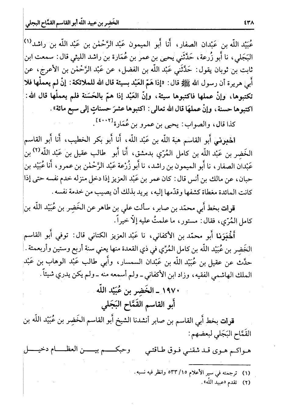 عبيد الله بن عبدان الصفار أنا أبو الميمون عبد الرحمن بن عبد الله بن راشد (1) البجلي نا أبو زرعة حدثني يحيى بن عمر بن عمارة بن راشد الليثي قال سمعت ابن ثابت بن ثوبان يقول حدثني عبد الله بن الفضل عن عبد الرحمن بن الأعرج عن أبي هريرة أن رسول الله (صلى الله عليه وسلم) قال إذا هم العبد بسيئة قال الله للملائكة إن لم يعملها فلا تكتبوها وإن عملها فاكتبوها سيئة وإن العبد إذا هم بالحسنة فلم يعملها قال الله اكتبوها حسنة وإن عملها قال الله تعالى اكتبوها عشر حسنات إلى سبع مائة كذا قال والصواب يحيى بن عمرو بن عمارة أخبرني أبو القاسم هبة الله بن عبد الله أنا أبو بكر الخطيب أنا أبو القاسم الخضر بن عبد الله بن كامل المري بدمشق أنا أبو طالب عقيل بن عبد الله (2) بن عبدان الصفار نا أبو الميمون بن راشد نا أبو زرعة عبد الرحمن بن عمرو أنا عبيد بن حبان عن مالك بن أنس قال كان عمر بن عبد العزيز إذا دخل منزله خدم نفسه حتى إذا كانت المائدة مغطاة كشفها وقدمها إليه يريد بذلك أن يصيب من خدمة نفسه قرأت بخط أبي محمد بن صابر سألت علي بن طاهر عن الخضر بن عبيد الله بن كامل المري فقال مستور ما علمت عليه إلا خيرا أخبرنا أبو محمد بن الأكفاني نا عبد العزيز الكتاني قال توفي أبو القاسم الخضر بن عبيد الله بن كامل المري في ذي القعدة منها يعني سنة أربع وستين وأربعمئة حدث عن عقيل بن عبيد الله بن عبدان السمسار وأبي طالب عبد الوهاب بن عبد الملك الهاشمي الفقيه وزاد ابن الأكفاني ولم أسمعه منه ولم يكن يدري شيئا