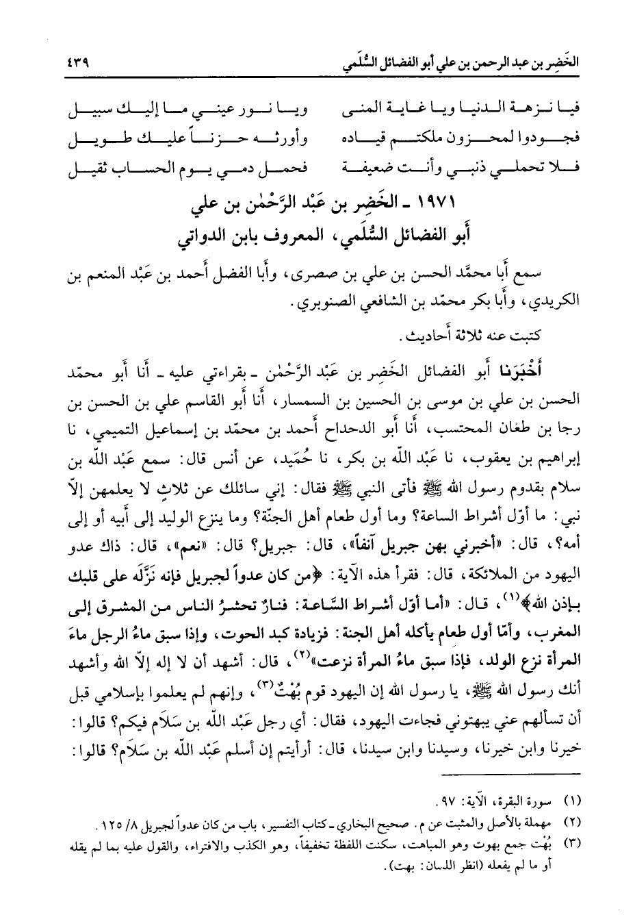 1971 - الخضر بن عبد الرحمن بن علي أبو الفضائل السلمي المعروف بابن الدواتي سمع أبا محمد الحسن بن علي بن صصرى وأبا الفضل أحمد بن عبد المنعم بن الكريدي وأبا بكر محمد بن الشافعي الصنوبري كتبت عنه ثلاثة أحاديث أخبرنا أبو الفضائل الخضر بن عبد الرحمن بقراءتي عليه أنا أبو محمد الحسن بن علي بن موسى بن الحسين بن السمسار أنا أبو القاسم علي بن الحسن بن رجا بن طغان المحتسب أنا أبو الدحداح أحمد بن محمد بن إسماعيل التميمي نا إبراهيم بن يعقوب نا عبد الله بن بكر نا حميد عن أنس قال سمع عبد الله بن سلام بقدوم رسول الله (صلى الله عليه وسلم) فأتى النبي (صلى الله عليه وسلم) فقال إني سائلك عن ثلاث لا يعلمهن إلا نبي ما أول أشراط الساعة وما أول طعام أهل الجنة وما ينزع الوليد إلى أبيه أو إلى أمه قال أخبرني بهن جبريل آنفا قال جبريل قال نعم قال ذاك عدو اليهود من الملائكة قال فقرأ هذه الآية " من كان عدوا لجبريل فإنه نزله على قلبك بإذن الله " (1) قال أما أول أشراط الساعة فنار تحشر الناس من المشرق إلى المغرب وأما أول طعام يأكله أهل الجنة فزيادة كبد الحوت وإذا سبق ماء الرجل ماء المرأة نزع الولد فإذا سبق ماء المرأة نزعت (2) قال أشهد أن لا إله إلا الله وأشهد أنك رسول الله (صلى الله عليه وسلم) يا رسول الله إن اليهود قوم بهت (3) وإنهم لم يعلموا بإسلامي قبل أن تسألهم عني يبهتوني فجاءت اليهود فقال أي رجل عبد الله بن سلام فيكم قالوا خيرنا وابن خيرنا وسيدنا وابن سيدنا قال أرأيتم إن أسلم عبد الله بن سلام قالوا
