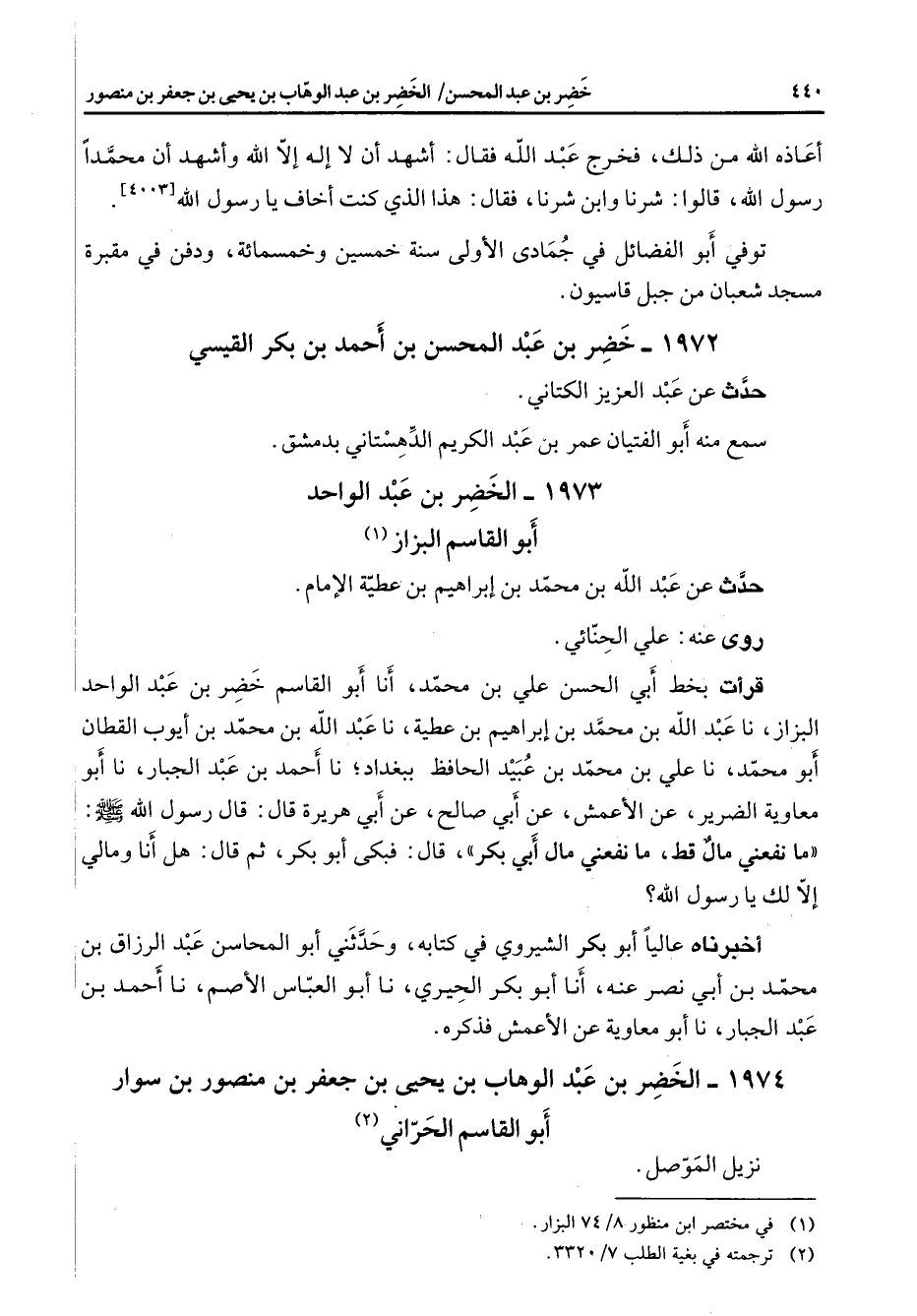 1973 - الخضر بن عبد الواحد أبو القاسم البزاز (1) حدث عن عبد الله بن محمد بن إبراهيم بن عطية الإمام روى عنه علي الحنائي قرأت بخط أبي الحسن علي بن محمد أنا أبو القاسم خضر بن عبد الواحد البزاز نا عبد الله بن محمد بن إبراهيم بن عطية نا عبد الله بن محمد بن أيوب القطان أبو محمد نا علي بن محمد بن عبيد الحافظ ببغداد نا أحمد بن عبد الجبار نا أبو معاوية الضرير عن الأعمش عن أبي صالح عن أبي هريرة قال قال رسول الله (صلى الله عليه وسلم) ما نفعني مال قط ما نفعني مال أبي بكر قال فبكى أبو بكر ثم قال هل أنا ومالي إلا لك يا رسول الله أخبرناه عاليا أبو بكر الشيروي في كتابه وحدثني أبو المحاسن عبد الرزاق بن محمد بن أبي نصر عنه أنا أبو بكر الحيري نا أبو العباس الأصم نا أحمد بن عبد الجبار نا أبو معاوية عن الأعمش فذكره