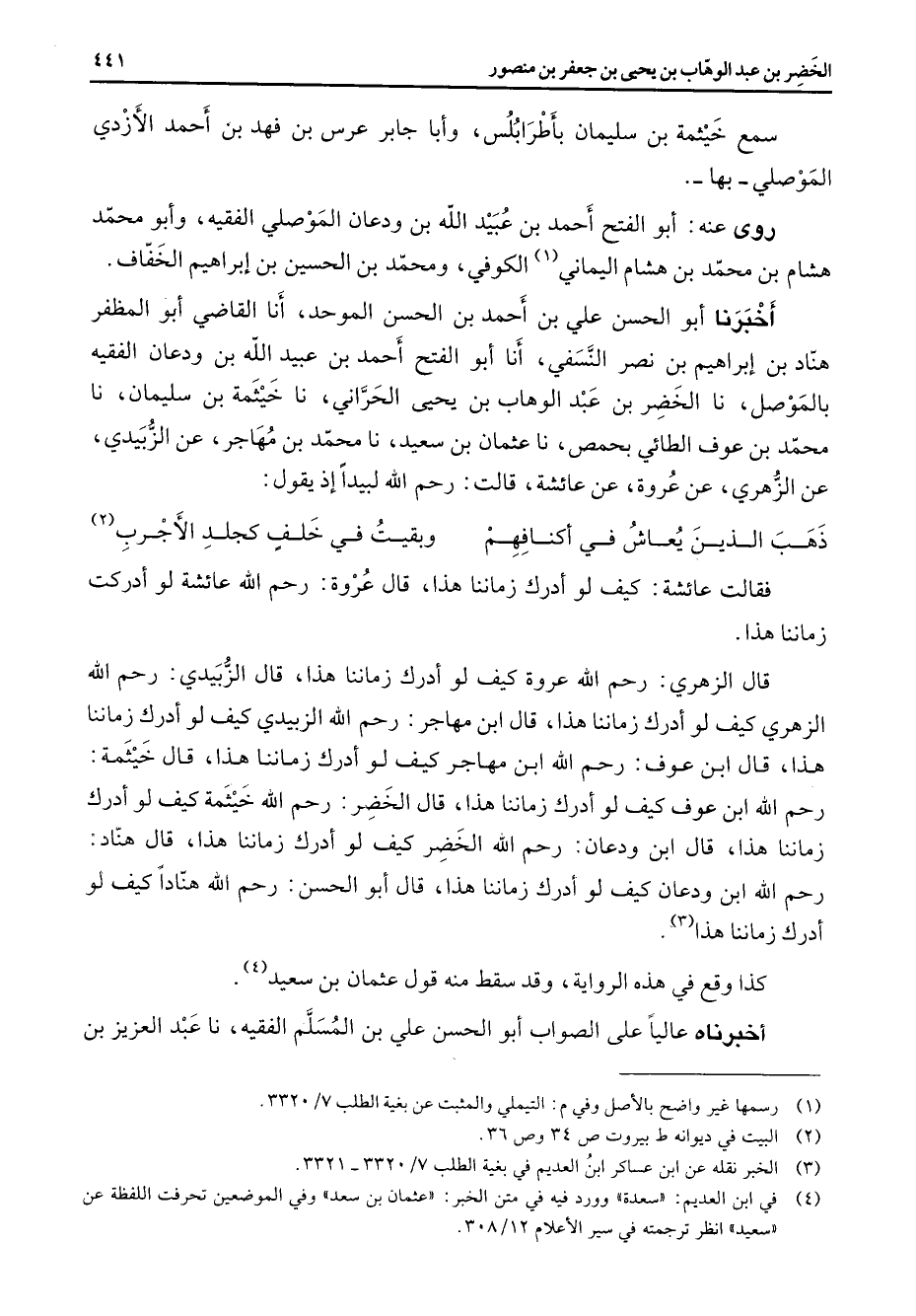 سمع خيثمة بن سليمان بأطرابلس وأبا جابر عرس بن فهد بن أحمد الأزدي الموصلي بها روى عنه أبو الفتح أحمد بن عبيد الله بن ودعان الموصلي الفقيه وأبو محمد هشام بن محمد بن هشام اليماني (1) الكوفي ومحمد بن الحسين بن إبراهيم الخفاف أخبرنا أبو الحسن علي بن أحمد بن الحسن الموحد أنا القاضي أبو المظفر هناد بن إبراهيم بن نصر النسفي أنا أبو الفتح أحمد بن عبيد الله بن ودعان الفقيه بالموصل نا الخضر بن عبد الوهاب بن يحيى الحراني نا خيثمة بن سليمان نا محمد بن عوف الطائي بحمص نا عثمان بن سعيد نا محمد بن مهاجر عن الزبيدي عن الزهري عن عروة عن عائشة قالت رحم الله لبيدا إذ يقول ذهب الذين يعاش في أكنافهم * وبقيت في خلف كجلد الأجرب (2) * فقالت عائشة كيف لو أدرك زماننا هذا قال عروة رحم الله عائشة لو أدركت زماننا هذا قال الزهري رحم الله عروة كيف لو أدرك زماننا هذا قال الزبيدي رحم الله الزهري كيف لو أدرك زماننا هذا قال ابن مهاجر رحم الله الزبيدي كيف لو أدرك زماننا هذا قال ابن عوف رحم الله ابن مهاجر كيف لو أدرك زماننا هذا قال خيثمة رحم الله ابن عوف كيف لو أدرك زماننا هذا قال الخضر رحم الله خيثمة كيف لو أدرك زماننا هذا قال ابن ودعان رحم الله الخضر كيف لو أدرك زماننا هذا قال هناد رحم الله ابن ودعان كيف لو أدرك زماننا هذا قال أبو الحسن رحم الله هنادا كيف لو أدرك زماننا هذا (3) كذا وقع في هذه الرواية وقد سقط منه قول عثمان بن سعيد (4) أخبرناه عاليا على الصواب أبو الحسن علي بن المسلم الفقيه نا عبد العزيز بن