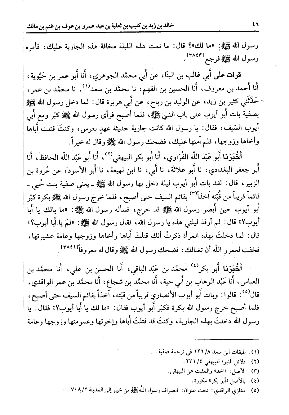 رسول الله (صلى الله عليه وسلم) مالك قال ما نمت هذه الليلة مخافة هذه الجارية عليك فأمره رسول الله (صلى الله عليه وسلم) فرجع قرأت على أبي غالب بن البنا عن أبي محمد الجوهري أنا أبو عمر بن حيوية أنا أحمد بن معروف أنا الحسين بن الفهم نا محمد بن سعد (1) نا محمد بن عمر حدثني كثير بن زيد عن الوليد بن رباح عن أبي هريرة قال لما دخل رسول الله (صلى الله عليه وسلم) بصفية بات أبو أيوب على باب النبي (صلى الله عليه وسلم) فلما أصبح فرأى رسول الله (صلى الله عليه وسلم) كبر ومع أبي أيوب السيف فقال يا رسول الله كانت جارية حديثة عهد بعرس وكنت قتلت أباها وأخاها وزوجها فلم آمنها عليك فضحك رسول الله (صلى الله عليه وسلم) وقال له خيرا أخبرنا أبو عبد الله الفراوي أنا أبو بكر البيهقي (2) أنا أبو عبد الله الحافظ أنا أبو جعفر البغدادي نا أبو علاثة نا أبي نا ابن لهيعة نا أبو الأسود عن عروة بن الزبير قال لقد بات أبو أيوب ليلة دخل بها رسول الله (صلى الله عليه وسلم) يعني صفية بنت حيي قائما قريبا من قبته آخذا (3) بقائم السيف حتى أصبح فلما خرج رسول الله (صلى الله عليه وسلم) بكرة كبر أبو أيوب حين أبصر رسول الله (صلى الله عليه وسلم) قد خرج فسأله رسول الله (صلى الله عليه وسلم) ما بالك يا أبا أيوب قال لم أرقد ليلتي هذه يا رسول الله فقال رسول الله (صلى الله عليه وسلم) لم يا أبا أيوب قال لما دخلت بهذه المرأة ذكرت أنك قتلت أباها وأخاها وزوجها وعامة عشيرتها فخفت لعمرو الله أن تغتالك فضحك رسول الله (صلى الله عليه وسلم) وقال له معروفا أخبرنا أبو بكر (4) محمد بن عبد الباقي أنا الحسن بن علي أنا محمد بن العباس أنا عبد الوهاب بن أبي حية أنا محمد بن شجاع أنا محمد بن عمر الواقدي قال (5) قالوا وبات أبو أيوب الأنصاري قريبا من قبته آخذا بقائم السيف حتى أصبح فلما أصبح خرج رسول الله بكرة فكبر أبو أيوب فقال ما لك يا أبا أيوب فقال يا رسول الله دخلت بهذه الجارية وكنت قد قتلت أباها وإخوتها وعمومتها وزوجها وعامة