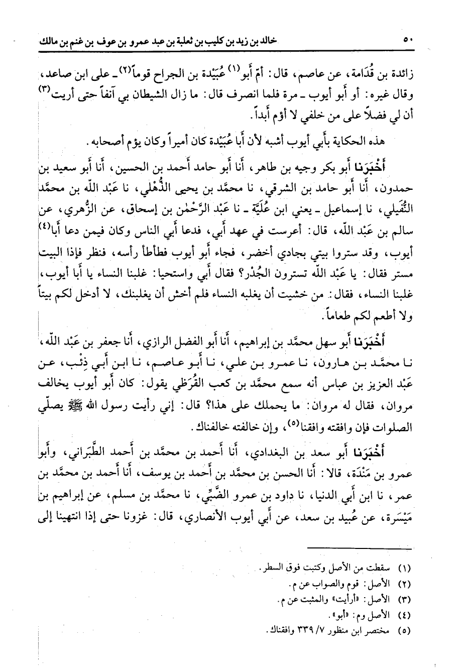 زائدة بن قدامة عن عاصم قال أم أبو (1) عبيدة بن الجراح قوما (2) على ابن صاعد وقال غيره أو أبو أيوب مرة فلما انصرف قال ما زال الشيطان بي آنفا حتى أريت (2) أن لي فضلا على من خلفي لا أؤم أبدا هذه الحكاية بأبي أيوب أشبه لأن أبا عبيدة كان أميرا وكان يؤم أصحابه أخبرنا أبو بكر وجيه بن طاهر أنا أبو حامد أحمد بن الحسين أنا أبو سعيد بن حمدون أنا أبو حامد بن الشرقي نا محمد بن يحيى الذهلي نا عبد الله بن محمد النفيلي نا إسماعيل يعني ابن علية نا عبد الرحمن بن إسحاق عن الزهري عن سالم بن عبد الله قال أعرست في عهد أبي فدعا أبي الناس وكان فيمن دعا أبا (4) أيوب وقد ستروا بيتي بجادي أخضر فجاء أبو أيوب فطأطأ رأسه فنظر فإذا البيت مستر فقال يا عبد الله تسترون الجدر فقال أبي واستحيا غلبنا النساء يا أبا أيوب غلبنا النساء فقال من خشيت أن يغلبه النساء فلم أخش أن يغلبنك لا أدخل لكم بيتا ولا أطعم لكم طعاما أخبرنا أبو سهل محمد بن إبراهيم أنا أبو الفضل الرازي أنا جعفر بن عبد الله نا محمد بن هارون نا عمرو بن علي نا أبو عاصم نا ابن أبي ذئب عن عبد العزيز بن عباس أنه سمع محمد بن كعب القرظي يقول كان أبو أيوب يخالف مروان فقال له مروان ما يحملك على هذا قال إني رأيت رسول الله (صلى الله عليه وسلم) يصلي الصلوات فإن وافقته وافقنا (5) وإن خالفته خالفناك أخبرنا أبو سعد بن البغدادي أنا أحمد بن محمد بن أحمد الطبراني وأبو عمرو بن مندة قالا أنا الحسن بن محمد بن أحمد بن يوسف أنا أحمد بن محمد بن عمر نا ابن أبي الدنيا نا داود بن عمرو الضبي نا محمد بن مسلم عن إبراهيم بن ميسرة عن عبيد بن سعد عن أبي أيوب الأنصاري قال غزونا حتى إذا انتهينا إلى