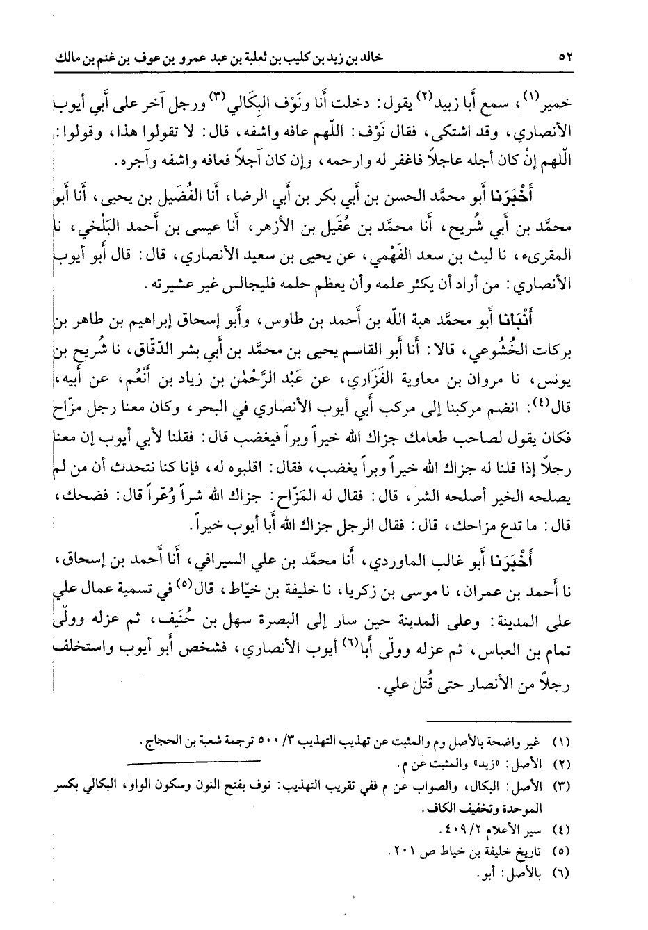 خمير (1) سمع أبا زبيد (2) يقول دخلت أنا ونوف البكالي (3) ورجل آخر على أبي أيوب الأنصاري وقد اشتكى فقال نوف اللهم عافه واشفه قال لا تقولوا هذا وقولوا اللهم إن كان أجله عاجلا فاغفر له وارحمه وإن كان آجلا فعافه واشفه وآجره أخبرنا أبو محمد الحسن بن أبي بكر بن أبي الرضا أنا الفضيل بن يحيى أنا أبو محمد بن أبي شريح أنا محمد بن عقيل بن الأزهر أنا عيسى بن أحمد البلخي نا المقرئ نا ليث بن سعد الفهمي عن يحيى بن سعيد الأنصاري قال قال أبو أيوب الأنصاري من أراد أن يكثر علمه وأن يعظم حلمه فليجالس غير عشيرته أنبأنا أبو محمد هبة الله بن أحمد بن طاوس وأبو إسحاق إبراهيم بن طاهر بن بركات الخشوعي قالا أنا أبو القاسم يحيى بن محمد بن أبي بشر الدقاق نا شريح بن يونس نا مروان بن معاوية الفزاري عن عبد الرحمن بن زياد بن أنعم عن أبيه قال (4) انضم مركبنا إلى مركب أبي أيوب الأنصاري في البحر وكان معنا رجل مزاح فكان يقول لصاحب طعامك جزاك الله خيرا وبرا فيغضب قال فقلنا لأبي أيوب إن معنا رجلا إذا قلنا له جزاك الله خيرا وبرا يغضب فقال اقلبوه له فإنا كنا نتحدث أن من لم يصلحه الخير أصلحه الشر قال فقال له المزاح جزاك الله شرا وعرا قال فضحك قال ما تدع مزاحك قال فقال الرجل جزاك الله أبا أيوب خيرا أخبرنا أبو غالب الماوردي أنا محمد بن علي السيرافي أنا أحمد بن إسحاق نا أحمد بن عمران نا موسى بن زكريا نا خليفة بن خياط قال (5) في تسمية عمال علي على المدينة وعلى المدينة حين سار إلى البصرة سهل بن حنيف ثم عزله وولى تمام بن العباس ثم عزله وولى أبا (6) أيوب الأنصاري فشخص أبو أيوب واستخلف