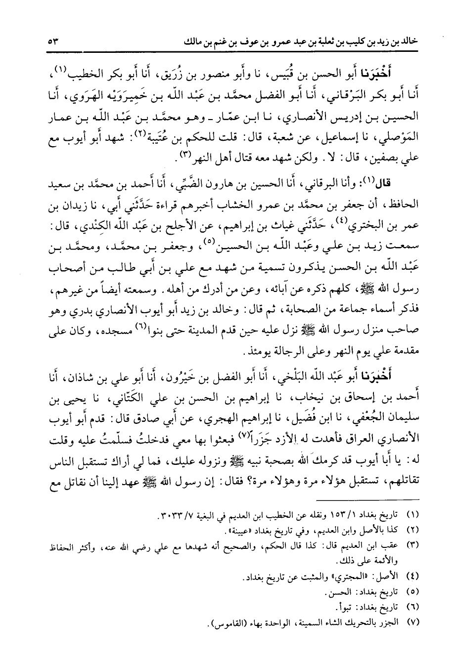 أخبرنا أبو الحسن بن قبيس نا وأبو منصور بن زريق أنا أبو بكر الخطيب (1) أنا أبو بكر البرقاني أنا أبو الفضل محمد بن عبد الله بن خميروية الهروي أنا الحسين بن إدريس الأنصاري نا ابن عمار وهو محمد بن عبد الله بن عمار الموصلي نا إسماعيل عن شعبة قال قلت للحكم بن عتيبة (2) شهد أبو أيوب مع علي بصفين قال لا ولكن شهد معه قتال أهل النهر (3) قال (1) وأنا البرقاني أنا الحسين بن هارون الضبي أنا أحمد بن محمد بن سعيد الحافظ أن جعفر بن محمد بن عمرو الخشاب أخبرهم قراءة حدثني أبي نا زيدان بن عمر بن البختري (4) حدثني غياث بن إبراهيم عن الأجلح بن عبد الله الكندي قال سمعت زيد بن علي وعبد الله بن الحسين (5) وجعفر بن محمد ومحمد بن عبد الله بن الحسن يذكرون تسمية من شهد مع علي بن أبي طالب من أصحاب رسول الله (صلى الله عليه وسلم) كلهم ذكره عن آبائه وعن من أدرك من أهله وسمعته أيضا من غيرهم فذكر أسماء جماعة من الصحابة ثم قال وخالد بن زيد أبو أيوب الأنصاري بدري وهو صاحب منزل رسول الله (صلى الله عليه وسلم) نزل عليه حين قدم المدينة حتى بنوا (6) مسجده وكان على مقدمة علي يوم النهر وعلى الرجالة يومئذ أخبرنا أبو عبد الله البلخي أنا أبو الفضل بن خيرون أنا أبو علي بن شاذان أنا أحمد بن إسحاق بن نيخاب نا إبراهيم بن الحسن بن علي الكتاني نا يحيى بن سليمان الجعفي نا ابن فضيل نا إبراهيم الهجري عن أبي صادق قال قدم أبو أيوب الأنصاري العراق فأهدت له الأزد جزرا (7) فبعثوا بها معي فدخلت فسلمت عليه وقلت له يا أبا أيوب قد كرمك الله بصحبة نبيه (صلى الله عليه وسلم) ونزوله عليك فما لي أراك تستقبل الناس تقاتلهم تستقبل هؤلاء مرة وهؤلاء مرة فقال إن رسول الله (صلى الله عليه وسلم) عهد إلينا أن نقاتل مع