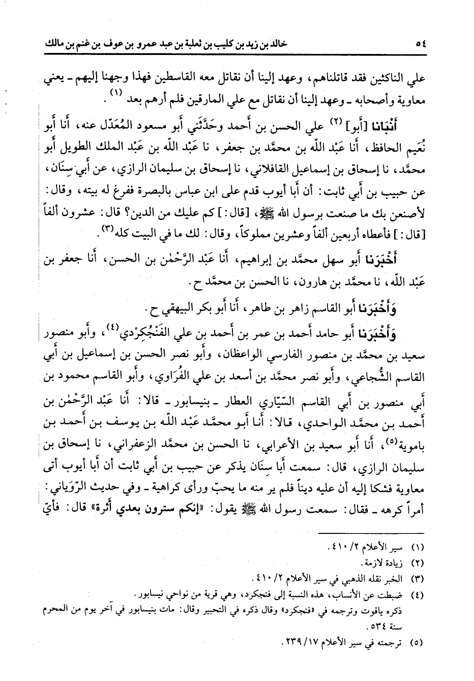 علي الناكثين فقد قاتلناهم وعهد إلينا أن نقاتل معه القاسطين فهذا وجهنا إليهم يعني معاوية وأصحابه وعهد إلينا أن نقاتل مع علي المارقين فلم أرهم بعد (1) أنبأنا أبو (2) علي الحسن بن أحمد وحدثني أبو مسعود المعدل عنه أنا أبو نعيم الحافظ أنا عبد الله بن محمد بن جعفر نا عبد الله بن عبد الملك الطويل أبو محمد نا إسحاق بن إسماعيل القافلاني نا إسحاق بن سليمان الرازي عن أبي سنان عن حبيب بن أبي ثابت أنا أبا أيوب قدم على ابن عباس بالبصرة ففرغ له بيته وقال لأصنعن بك ما صنعت برسول الله (صلى الله عليه وسلم) قال كم عليك من الدين قال عشرون ألفا قال فأعطاه أربعين ألفا وعشرين مملوكا وقال لك ما في البيت كله (3) أخبرنا أبو سهل محمد بن إبراهيم أنا عبد الرحمن بن الحسن أنا جعفر بن عبد الله نا محمد بن هارون نا الحسن بن محمد وأخبرنا أبو القاسم زاهر بن طاهر أنا أبو بكر البيهقي وأخبرنا أبو حامد أحمد بن عمر بن أحمد بن علي الفنجكردي (4) وأبو منصور سعيد بن محمد بن منصور الفارسي الواعظان وأبو نصر الحسن بن إسماعيل بن أبي القاسم الشجاعي وأبو نصر محمد بن أسعد بن علي الفراوي وأبو القاسم محمود بن أبي منصور بن أبي القاسم السياري العطار بنيسابور قالا أنا عبد الرحمن بن أحمد بن محمد الواحدي قالا أنا أبو محمد عبد الله بن يوسف بن أحمد بن باموية أنا أبو سعيد بن الأعرابي نا الحسن بن محمد الزعفراني نا إسحاق بن سليمان الرازي قال سمعت أبا سنان يذكر عن حبيب بن أبي ثابت أن أبا أيوب أتى معاوية فشكا إليه أن عليه دينا فلم ير منه ما يحب ورأى كراهية وفي حديث الروياني أمرا كرهه فقال سمعت رسول الله (صلى الله عليه وسلم) يقول إنكم سترون بعدي أثرة قال فأي
