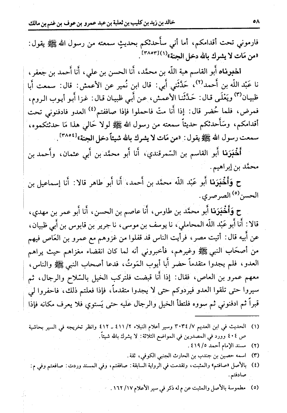 (1) الحديث في ابن العديم 7 / 3034 وسير أعلام النبلاء 2 / 411 - 412 وانظر تخريجه في السير بحاشية ص 404 وورد في المصدرين في المواضع الثلاثة: لا يشرك بالله شيئا