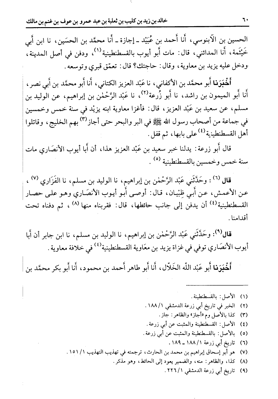 الحسين بن الآبنوسي أنا أحمد بن عبيد إجازة أنا محمد بن الحسين نا إبن أبي خيثمة أنا المدائني قال مات أبو أيوب بالقسطنطينية (1) ودفن في أصل المدينة ودخل عليه يزيد بن معاوية وقال حاجتك قال تعمق قبري وتوسعه أخبرنا أبو محمد بن الأكفاني نا عبد العزيز الكتاني أنا أبو محمد بن أبي نصر أنا أبو الميمون بن راشد نا أبو زرعة (2) نا عبد الرحمن بن إبراهيم عن الوليد بن مسلم عن سعيد بن عبد العزيز قال فأغزا معاوية ابنه يزيد في سنة خمس وخمسين في جماعة من أصحاب رسول الله (صلى الله عليه وسلم) في البر والبحر حتى أجاز (3) بهم الخليج وقاتلوا أهل القسطنطينية (4) ح على بابها ثم قفل قال أبو زرعة يدلنا خبر سعيد بن عبد العزيز هذا أن أبا أيوب الأنصاري مات سنة خمس وخمسين بالقسطنطينية (5) قال (6) وحدثني عبد الرحمن بن إبراهيم نا الوليد بن مسلم نا الفزاري (7) عن الأعمش عن أبي ظبيان قال أوصى أبو أيوب الأنصاري وهو على حصار القسطنطينية (4) أن يدفن إلى جانب حائطها قال فقربناه منها (8) ثم دفناه تحت أقدامنا قال (9) وحدثني عبد الرحمن بن إبراهيم نا الوليد بن مسلم نا ابن جابر أن أبا أيوب الأنصاري توفى في غزاة يزيد بن معاوية القسطنطينية في خلافة معاوية أخبرنا أبو عبد الله الخلال أنا أبو طاهر أحمد بن محمود أنا أبو بكر محمد بن