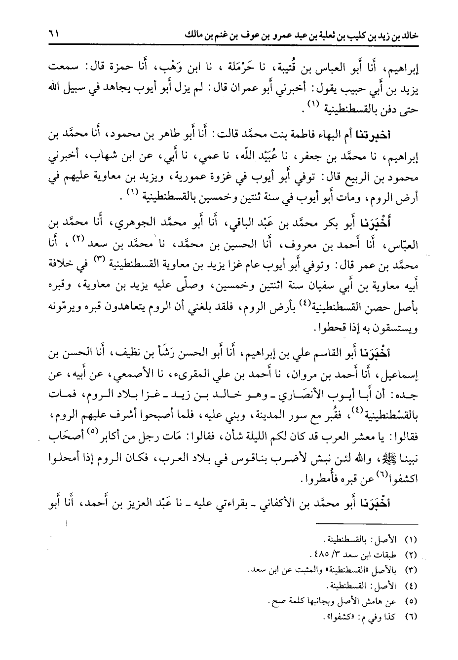 إبراهيم أنا أبو العباس بن قتيبة نا حرملة نا ابن وهب أنا حمزة قال سمعت يزيد بن أبي حبيب يقول أخبرني أبو عمران قال لم يزل أبو أيوب يجاهد في سبيل الله حتى دفن بالقسطنطينية (1) أخبرتنا أم البهاء فاطمة بنت محمد قالت أنا أبو طاهر بن محمود أنا محمد بن إبراهيم نا محمد بن جعفر نا عبيد الله نا عمي نا أبي عن ابن شهاب أخبرني محمود بن الربيع قال توفي أبو أيوب في غزوة عمورية ويزيد بن معاوية عليهم في أرض الروم ومات أبو أيوب في سنة ثنتين وخمسين بالقسطنطينية (1) أخبرنا أبو بكر محمد بن عبد الباقي أنا أبو محمد الجوهري أنا محمد بن العباس أنا أحمد بن معروف أنا الحسين بن محمد نا محمد بن سعد (2) أنا محمد بن عمر قال وتوفي أبو أيوب عام غزا يزيد بن معاوية القسطنطينية (3) في خلافة أبيه معاوية بن أبي سفيان سنة اثنتين وخمسين وصلى عليه يزيد بن معاوية وقبره بأصل حصن القسطنطينية (4) بأرض الروم فلقد بلغني أن الروم يتعاهدون قبره ويرمونه ويستسقون به إذا قحطوا أخبرنا أبو القاسم علي بن إبراهيم أنا أبو الحسن رشأ بن نظيف أنا الحسن بن إسماعيل أنا أحمد بن مروان نا أحمد بن علي المقرئ نا الأصمعي عن أبيه عن جده أن أبا أيوب الأنصاري وهو خالد بن زيد غزا بلاد الروم فمات بالقسطنطينية (4) فقبر مع سور المدينة وبني عليه فلما أصبحوا أشرف عليهم الروم فقالوا يا معشر العرب قد كان لكم الليلة شأن فقالوا مات رجل من أكابر (5) أصحاب نبينا (صلى الله عليه وسلم) والله لئن نبش لأضرببناقوس في بلاد العرب فكان الروم إذا أمحلوا اكشفوا (6) عن قبره فأمطروا أخبرنا أبو محمد بن الأكفاني بقراءتي عليه نا عبد العزيز بن أحمد أنا أبو