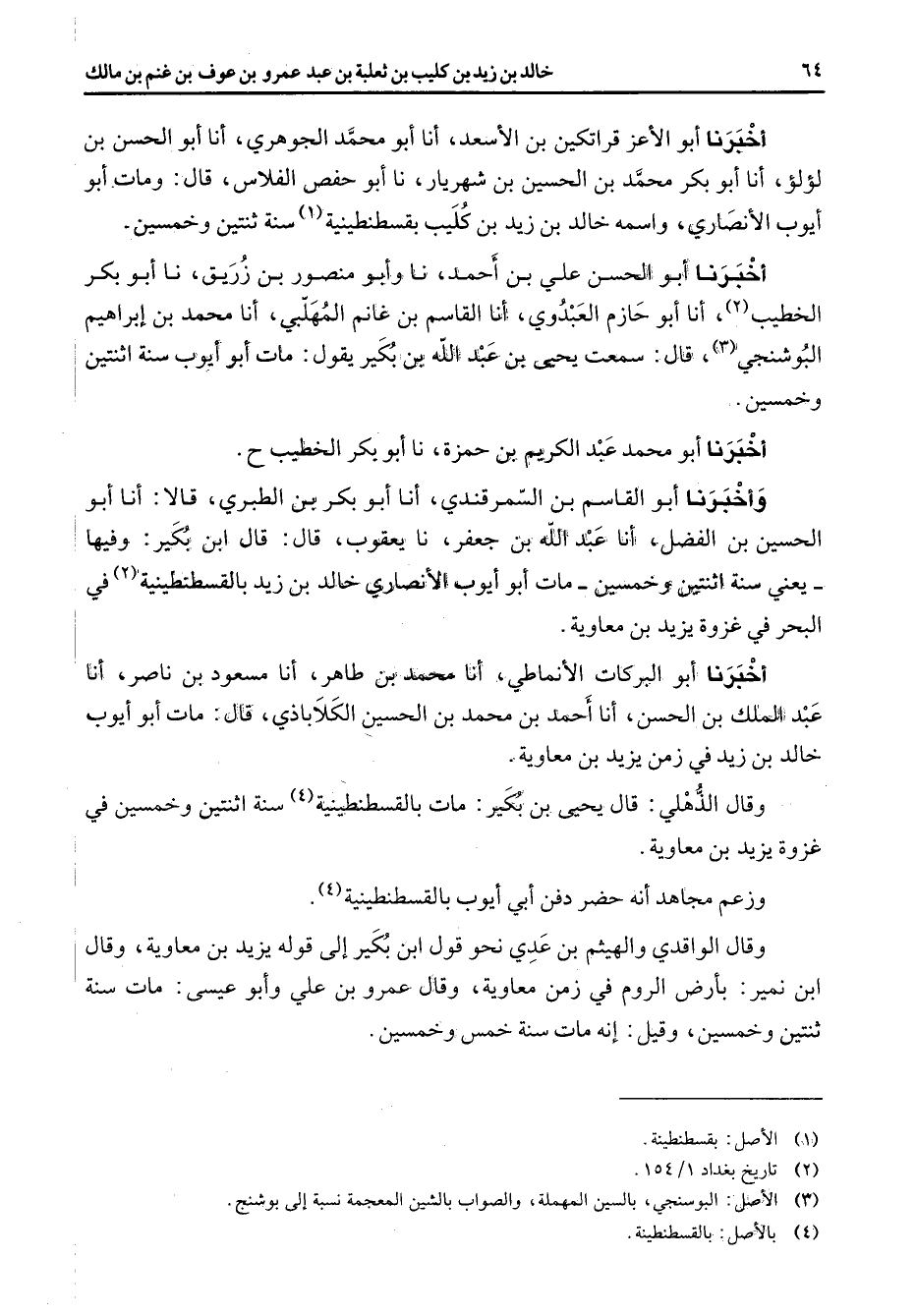 أخبرنا أبو الأعز قراتكين بن الأسعد أنا أبو محمد الجوهري أنا أبو الحسن بن لؤلؤ أنا أبو بكر محمد بن الحسين بن شهريار نا أبو حفص الفلاس قال ومات أبو أيوب الأنصاري واسمه خالد بن زيد بن كليب بقسطنطينية (1) سنة ثنتين وخمسين أخبرنا أبو الحسن علي بن أحمد نا وأبو منصور بن زريق نا أبو بكر الخطيب (2) أنا أبو حازم العبدوي أنا القاسم بن غالب المهلبي أنا محمد بن إبراهيم البوشنجي (3) قال سمعت يحيى بن عبد الله بن بكير يقول مات أبو أيوب سنة اثنتين وخمسين أخبرنا أبو محمد عبد الكريم بن حمزة نا أبو بكر الخطيب وأخبرنا أبو القاسم بن السمرقندي أنا أبو بكر بن الطبري قالا أنا أبو الحسين بن الفضل أنا عبد الله بن جعفر نا يعقوب قال قال ابن بكير وفيها يعني سنة اثنتين وخمسين مات أبو أيوب الأنصاري خالد بن زيد بالقسطنطينية (2) في البحر في غزوة يزيد بن معاوية أخبرنا أبو البركات الأنماطي أنا محمد بن طاهر أنا مسعود بن ناصر أنا عبد الملك بن الحسن أنا أحمد بن محمد بن الحسين الكلاباذي قال مات أبو أيوب خالد بن زيد في زمن يزيد بن معاوية وقال الذهلي قال يحيى بن بكير مات بالقسطنطينة (4) سنة اثنتين وخمسين في غزوة يزيد بن معاوية وزعم مجاهد أنه حضر دفن أبي أيوب بالقسطنطينية (4) وقال الواقدي والهيثم بن عدي نحو قول ابن بكير إلى قوله يزيد بن معاوية وقال ابن نمير بأرض الروم في زمن معاوية وقال عمرو بن علي وأبو عيسى مات سنة ثنتين وخمسين وقيل إنه مات سنة خمس وخمسين