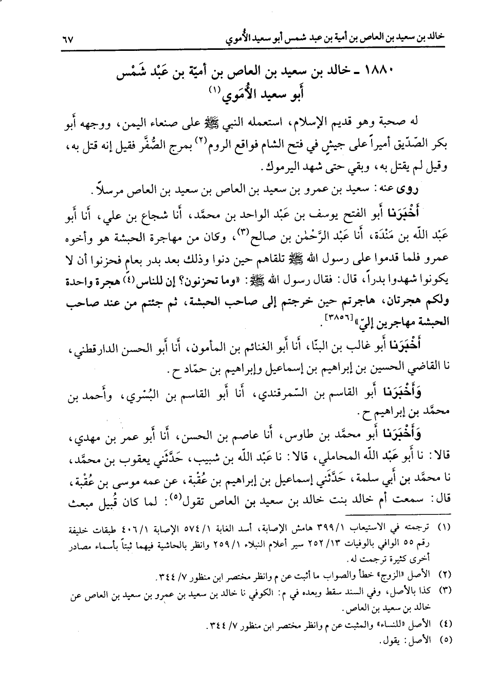 1880 - خالد بن سعيد بن العاص بن أمية بن عبد شمس أبو سعيد الأموي (1) له صحبة وهو قديم الإسلام استعمله النبي (صلى الله عليه وسلم) على صنعاء اليمن ووجهه أبو بكر الصديق أميرا على جيش في فتح الشام فواقع الروم (2) بمرج الصفر فقيل إنه قتل به وقيل لم يقتل به وبقي حتى شهد اليرموك روى عنه سعيد بن عمرو بن سعيد بن العاص بن سعيد بن العاص مرسلا أخبرنا أبو الفتح يوسف بن عبد الواحد بن محمد أنا شجاع بن علي أنا أبو عبد الله بن مندة أنا عبد الرحمن بن صالح (3) وكان من مهاجرة الحبشة هو وأخوه عمرو فلما قدموا على رسول الله (صلى الله عليه وسلم) تلقاهم حين دنوا وذلك بعد بدر بعام فحزنوا أن لا يكونوا شهدوا بدرا قال فقال رسول الله (صلى الله عليه وسلم) وما تحزنون إن للناس (4) هجرة واحدة ولكم هجرتان هاجرتم حين خرجتم إلى صاحب الحبشة ثم جئتم من عند صاحب الحبشة مهاجرين إلي أخبرنا أبو غالب بن البنا أنا أبو الغنائم بن المأمون أنا أبو الحسن الدارقطني نا القاضي الحسين بن إبراهيم بن إسماعيل وإبراهيم بن حماد وأخبرنا أبو القاسم بن السمرقندي أنا أبو القاسم بن البسري وأحمد بن محمد بن إبراهيم وأخبرنا أبو محمد بن طاوس أنا عاصم بن الحسن أنا أبو عمر بن مهدي قالا نا أبو عبد الله المحاملي قالا نا عبد الله بن شبيب حدثني يعقوب بن محمد نا محمد بن أبي سلمة حدثني إسماعيل بن إبراهيم بن عقبة عن عمه موسى بن عقبة قال سمعت أم خالد بنت خالد بن سعيد بن العاص تقول (5) لما كان قبيل مبعث