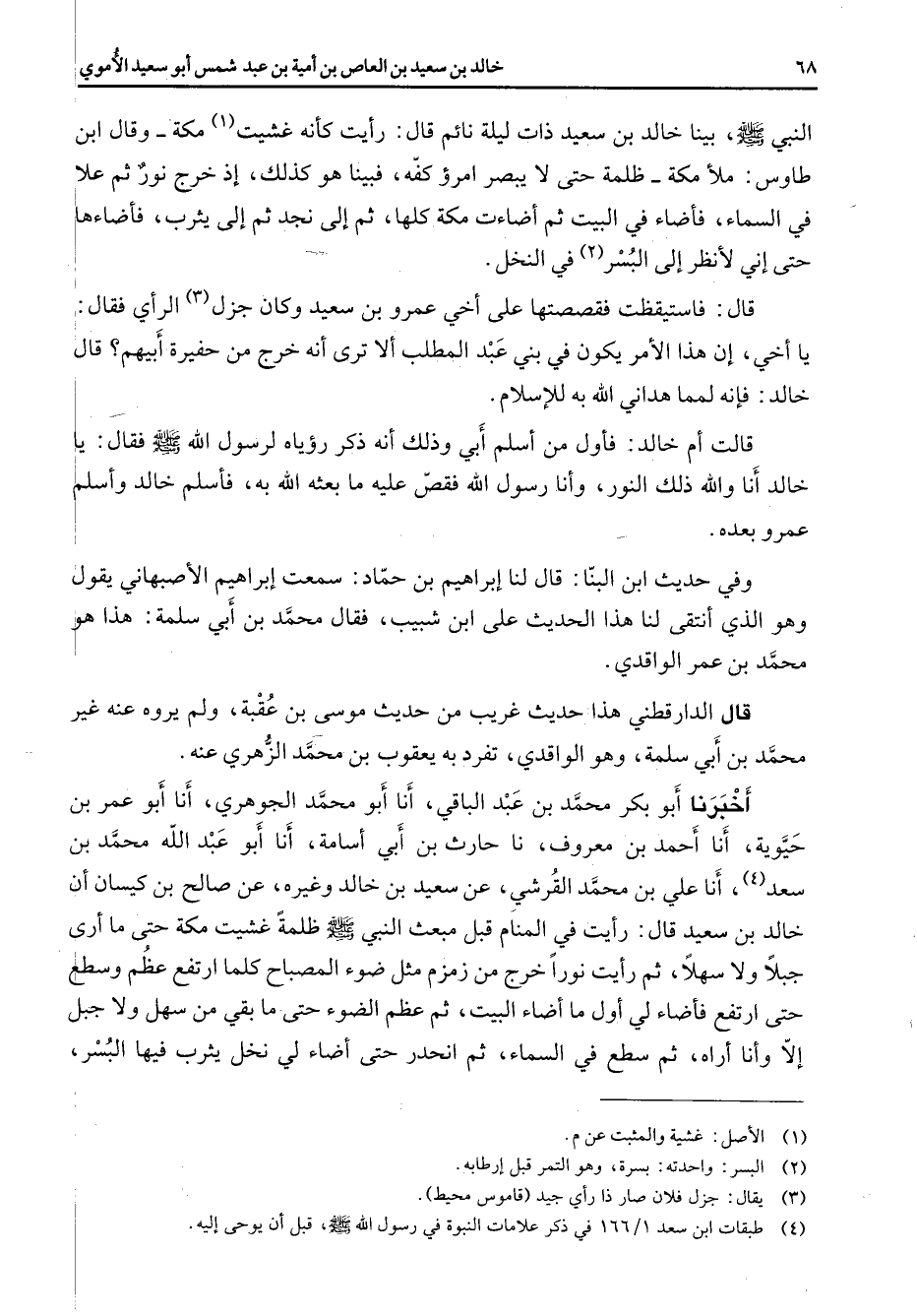 النبي (صلى الله عليه وسلم) بينا خالد بن سعيد ذات ليلة نائم قال رأيت كأنه غشيت (1) مكة وقال ابن طاوس ملأ مكة ظلمة حتى لا يبصر امرؤ كفه فبينا هو كذلك إذ خرج نور ثم علا في السماء فأضاء في البيت ثم أضاءت مكة كلها ثم إلى نجد ثم إلى يثرب فأضاءها حتى إني لأنظر إلى البسر (2) في النخل قال فاستيقظت فقصصتها على أخي عمرو بن سعيد وكان جزل (3) الرأي فقال يا أخي إن هذا الأمر يكون في بني عبد المطلب ألا ترى أنه خرج من حفيرة أبيهم قال خالد فإنه لمما هداني الله به للإسلام قالت أم خالد فأول من أسلم أبي وذلك أنه ذكر رؤياه لرسول الله (صلى الله عليه وسلم) فقال يا خالد أنا والله ذلك النور وأنا رسول الله فقص عليه ما بعثه الله به فأسلم خالد وأسلم عمرو بعده وفي حديث ابن البنا قال لنا إبراهيم بن حماد سمعت إبراهيم الأصبهاني يقول وهو الذي أنتقى لنا هذا الحديث على ابن شبيب فقال محمد بن أبي سلمة هذا هو محمد بن عمر الواقدي قال الدارقطني هذا حديث غريب من حديث موسى بن عقبة ولم يروه عنه غير محمد بن أبي سلمة وهو الواقدي تفرد به يعقوب بن محمد الزهري عنه أخبرنا أبو بكر محمد بن عبد الباقي أنا أبو محمد الجوهري أنا أبو عمر بن حيوية أنا أحمد بن معروف نا حارث بن أبي أسامة أنا أبو عبد الله محمد بن سعد (4) أنا علي بن محمد القرشي عن سعيد بن خالد وغيره عن صالح بن كيسان أن خالد بن سعيد قال رأيت في المنام قبل مبعث النبي (صلى الله عليه وسلم) ظلمة غشيت مكة حتى ما أرى جبلا ولا سهلا ثم رأيت نورا خرج من زمزم مثل ضوء المصباح كلما ارتفع عظم وسطع حتى ارتفع فأضاء لي أول ما أضاء البيت ثم عظم الضوء حتى ما بقي من سهل ولا جبل إلا وأنا أراه ثم سطع في السماء ثم انحدر حتى أضاء لي نخل يثرب فيها البسر