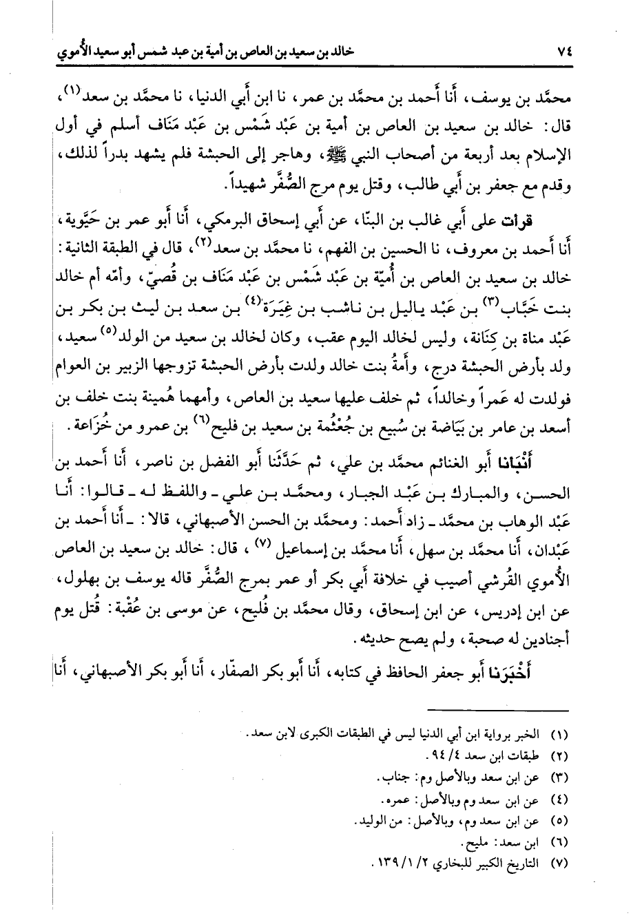 محمد بن يوسف أنا أحمد بن محمد بن عمر نا ابن أبي الدنيا نا محمد بن سعد (1) قال خالد بن سعيد بن العاص بن أمية بن عبد شمس بن عبد مناف أسلم في أول الإسلام بعد أربعة من أصحاب النبي (صلى الله عليه وسلم) وهاجر إلى الحبشة فلم يشهد بدرا لذلك وقدم مع جعفر بن أبي طالب وقتل يوم مرج الصفر شهيدا قرأت على أبي غالب بن البنا عن أبي إسحاق البرمكي أنا أبو عمر بن حيوية أنا أحمد بن معروف نا الحسين بن الفهم نا محمد بن سعد (2) قال في الطبقة الثانية خالد بن سعيد بن العاص بن أمية بن عبد شمس بن عبد مناف بن قصي وأمه أم خالد بنت خباب (3) بن عبد ياليل بن ناشب بن غيرة (4) بن سعد بن ليث بن بكر بن عبد مناة بن كنانة وليس لخالد اليوم عقب وكان لخالد بن سعيد من الولد (5) سعيد ولد بأرض الحبشة درج وأمة بنت خالد ولدت بأرض الحبشة تزوجها الزبير بن العوام فولدت له عمرا وخالدا ثم خلف عليها سعيد بن العاص وأمهما همينة بنت خلف بن أسعد بن عامر بن بياضة بن سبيع بن جعثمة بن سعيد بن فليح (6) بن عمرو من خزاعة أنبأنا أبو الغنائم محمد بن علي ثم حدثنا أبو الفضل بن ناصر أنا أحمد بن الحسن والمبارك بن عبد الجبار ومحمد بن علي واللفظ له قالوا أنا عبد الوهاب بن محمد زاد أحمد ومحمد بن الحسن الأصبهاني قالا أنا أحمد بن عبدان أنا محمد بن سهل أنا محمد بن إسماعيل (7) قال خالد بن سعيد بن العاص الأموي القرشي أصيب في خلافة أبي بكر أو عمر بمرج الصفر قاله يوسف بن بهلول عن ابن إدريس عن ابن إسحاق وقال محمد بن فليح عن موسى بن عقبة قتل يوم أجنادين له صحبة ولم يصح حديثه أخبرنا أبو جعفر الحافظ في كتابه أنا أبو بكر الصفار أنا أبو بكر الأصبهاني أنا