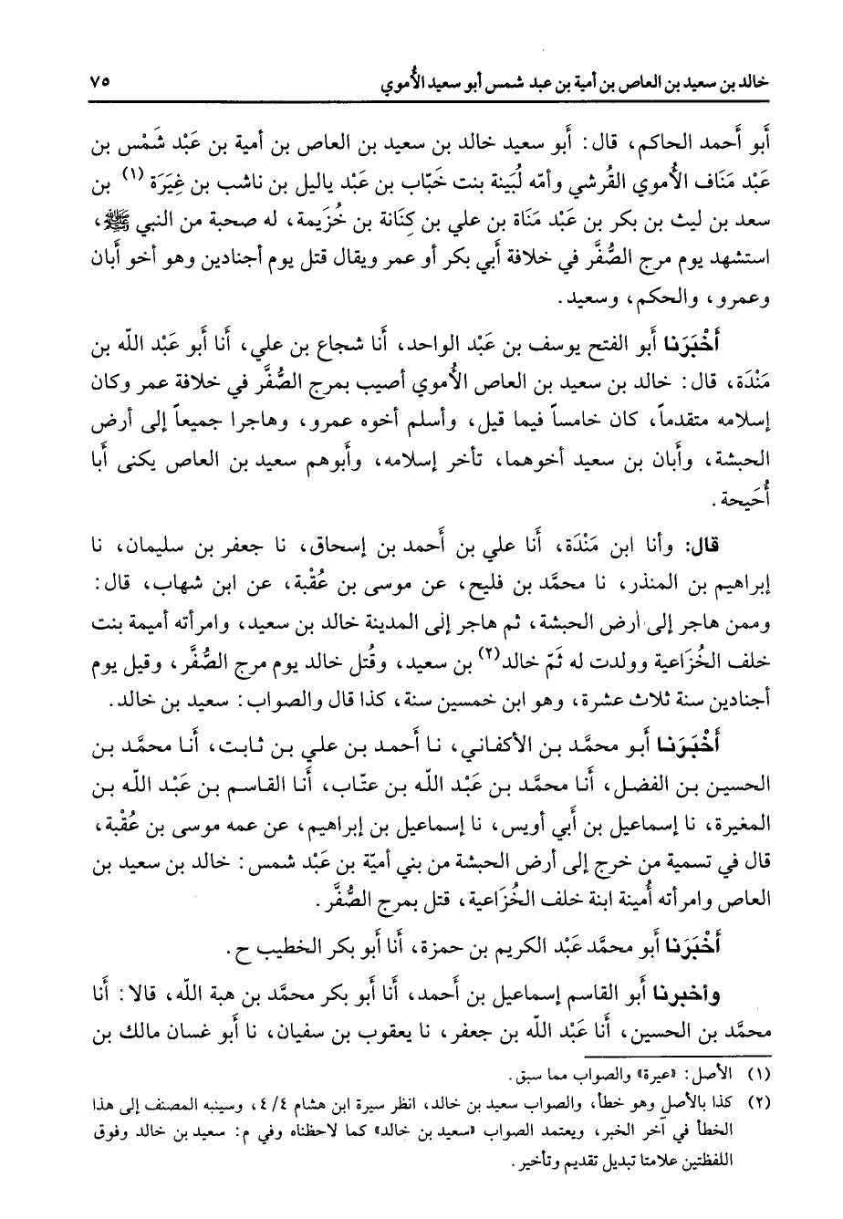 أبو أحمد الحاكم قال أبو سعيد خالد بن سعيد بن العاص بن أمية بن عبد شمس بن عبد مناف الأموي القرشي وأمه لبينة بنت خباب بن عبد ياليل بن ناشب بن غيرة (1) بن سعد بن ليث بن بكر بن عبد مناة بن علي بن كنانة بن خزيمة له صحبة من النبي (صلى الله عليه وسلم) استشهد يوم مرج الصفر في خلافة أبي بكر أو عمر ويقال قتل يوم أجنادين وهو أخو أبان وعمرو والحكم وسعيد أخبرنا أبو الفتح يوسف بن عبد الواحد أنا شجاع بن علي أنا أبو عبد الله بن مندة قال خالد بن سعيد بن العاص الأموي أصيب بمرج الصفر في خلافة عمر وكان إسلامه متقدما كان خامسا فيما قيل وأسلم أخوه عمرو وهاجرا جميعا إلى أرض الحبشة وأبان بن سعيد أخوهما تأخر إسلامه وأبوهم سعيد بن العاص يكنى أبا أحيحة قال وأنا ابن مندة أنا علي بن أحمد بن إسحاق نا جعفر بن سليمان نا إبراهيم بن المنذر نا محمد بن فليح عن موسى بن عقبة عن ابن شهاب قال وممن هاجر إلى أرض الحبشة ثم هاجر إلى المدينة خالد بن سعيد وامرأته أميمة بنت خلف الخزاعية وولدت له ثم خالد (2) بن سعيد وقتل خالد يوم مرج الصفر وقيل يوم أجنادين سنة ثلاث عشرة وهو ابن خمسين سنة كذا قال والصواب سعيد بن خالد أخبرنا أبو محمد بن الأكفاني نا أحمد بن علي بن ثابت أنا محمد بن الحسين بن الفضل أنا محمد بن عبد الله بن عتاب أنا القاسم بن عبد الله بن المغيرة نا إسماعيل بن أبي أويس نا إسماعيل بن إبراهيم عن عمه موسى بن عقبة قال في تسمية من خرج إلى أرض الحبشة من بني أمية بن عبد شمس خالد بن سعيد بن العاص وامرأته أمينة ابنة خلف الخزاعية قتل بمرج الصفر أخبرنا أبو محمد عبد الكريم بن حمزة أنا أبو بكر الخطيب وأخبرنا أبو القاسم إسماعيل بن أحمد أنا أبو بكر محمد بن هبة الله قالا أنا محمد بن الحسين أنا عبد الله بن جعفر نا يعقوب بن سفيان نا أبو غسان مالك بن