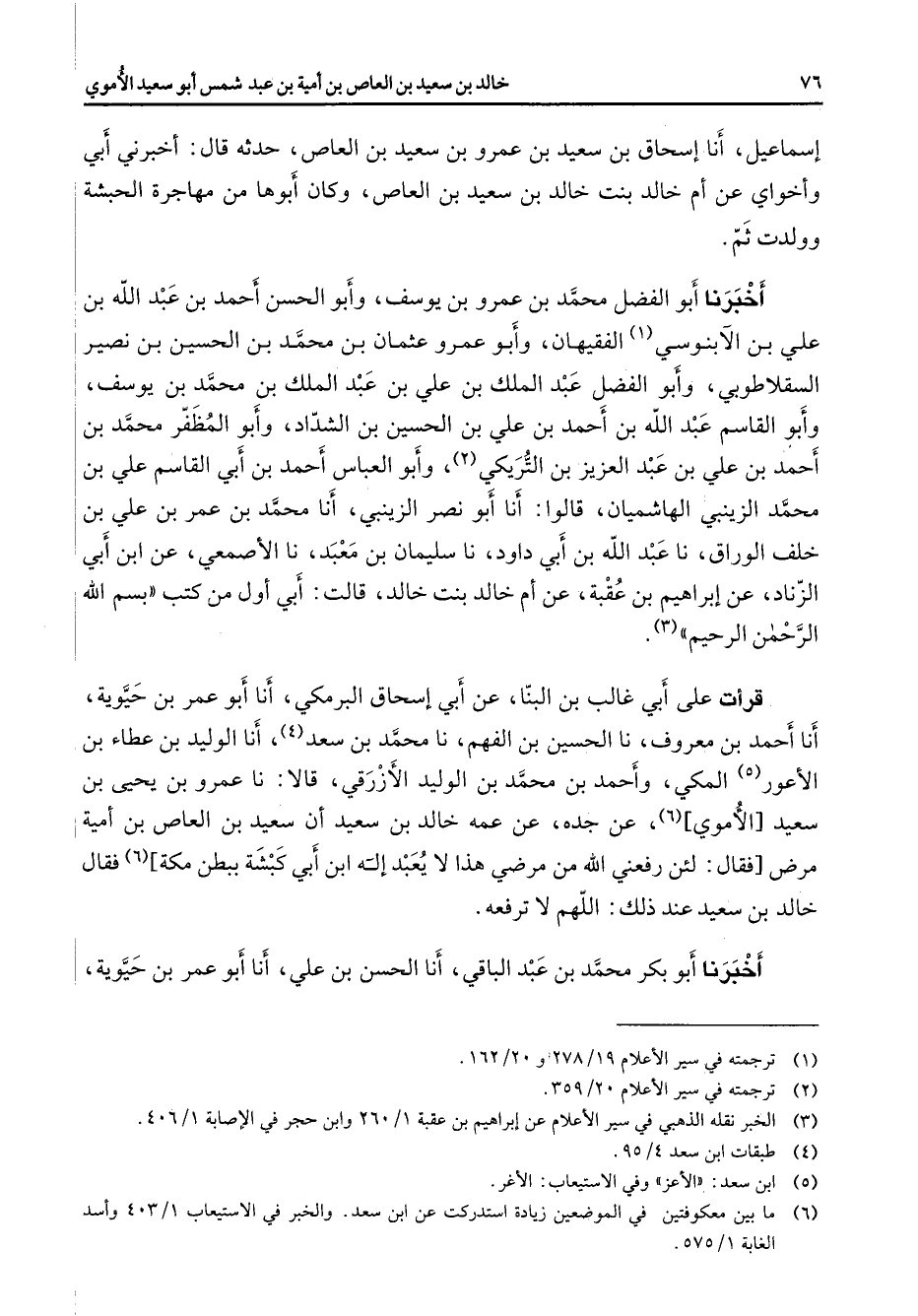 إسماعيل أنا إسحاق بن سعيد بن عمرو بن سعيد بن العاص حدثه قال أخبرني أبي وأخواي عن أم خالد بنت خالد بن سعيد بن العاص وكان أبوها من مهاجرة الحبشة وولدت ثم أخبرنا أبو الفضل محمد بن عمرو بن يوسف وأبو الحسن أحمد بن عبد الله بن علي بن الآبنوسي (1) الفقيهان وأبو عمرو عثمان بن محمد بن الحسين بن نصير السقلاطوبي وأبو الفضل عبد الملك بن علي بن عبد الملك بن محمد بن يوسف وأبو القاسم عبد الله بن أحمد بن علي بن الحسين بن الشداد وأبو المظفر محمد بن أحمد بن علي بن عبد العزيز بن التريكي (2) وأبو العباس أحمد بن أبي القاسم علي بن محمد الزينبي الهاشميان قالوا أنا أبو نصر الزينبي أنا محمد بن عمر بن علي بن خلف الوراق نا عبد الله بن أبي داود نا سليمان بن معبد نا الأصمعي عن ابن أبي الزناد عن إبراهيم بن عقبة عن أم خالد بنت خالد قالت أبي أول من كتب بسم الله الرحمن الرحيم (3) قرأت على أبي غالب بن البنا عن أبي إسحاق البرمكي أنا أبو عمر بن حيوية أنا أحمد بن معروف نا الحسين بن الفهم نا محمد بن سعد (4) أنا الوليد بن عطاء بن الأعور (5) المكي وأحمد بن محمد بن الوليد الأزرقي قالا نا عمرو بن يحيى بن سعيد الأموي (6) عن جده عن عمه خالد بن سعيد أن سعيد بن العاص بن أمية مرض فقال لئن رفعني الله من مرضي هذا لا يعبد إله ابن أبي كبشة ببطن مكة (6) فقال خالد بن سعيد عند ذلك اللهم لا ترفعه أخبرنا أبو بكر محمد بن عبد الباقي أنا الحسن بن علي أنا أبو عمر بن حيوية