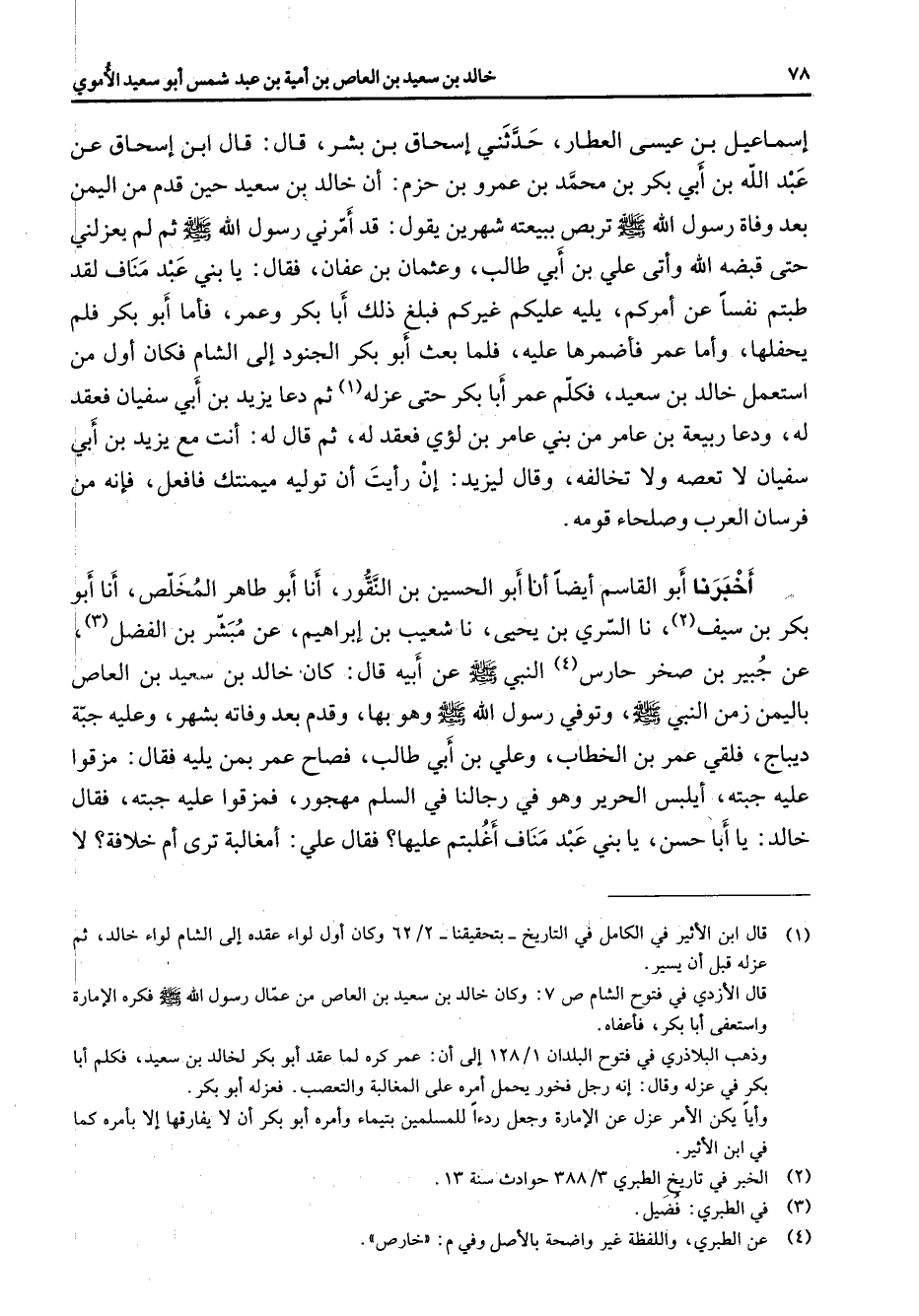 إسماعيل بن عيسى العطار حدثني إسحاق بن بشر قال قال ابن إسحاق عن عبد الله بن أبي بكر بن محمد بن عمرو بن حزم أن خالد بن سعيد حين قدم من اليمن بعد وفاة رسول الله (صلى الله عليه وسلم) تربص ببيعته شهرين يقول قد أمرني رسول الله (صلى الله عليه وسلم) ثم لم يعزلني حتى قبضه الله وأتى علي بن أبي طالب وعثمان بن عفان فقال يا بني عبد مناف لقد طبتم نفسا عن أمركم يليه عليكم غيركم فبلغ ذلك أبا بكر وعمر فأما أبو بكر فلم يحفلها وأما عمر فأضمرها عليه فلما بعث أبو بكر الجنود إلى الشام فكان أول من استعمل خالد بن سعيد فكلم عمر أبا بكر حتى عزله (1) ثم دعا يزيد بن أبي سفيان فعقد له ودعا ربيعة بن عامر من بني عامر بن لؤي فعقد له ثم قال له أنت مع يزيد بن أبي سفيان لا تعصه ولا تخالفه وقال ليزيد إن رأيت أن توليه ميمنتك فافعل فإنه من فرسان العرب وصلحاء قومه أخبرنا أبو القاسم أيضا أنا أبو الحسين بن النقور أنا أبو طاهر المخلص أنا أبو بكر بن سيف (2) نا السري بن يحيى نا شعيب بن إبراهيم عن مبشر بن الفضل (3) عن جبير بن صخر حارس (4) النبي (صلى الله عليه وسلم) عن أبيه قال كان خالد بن سعيد بن العاص باليمن زمن النبي (صلى الله عليه وسلم) وتوفي رسول الله (صلى الله عليه وسلم) وهو بها وقدم بعد وفاته بشهر وعليه جبة ديباج فلقي عمر بن الخطاب وعلي بن أبي طالب فصاح عمر بمن يليه فقال مزقوا عليه جبته أيلبس الحرير وهو في رجالنا في السلم مهجور فمزقوا عليه جبته فقال خالد يا أبا حسن يا بني عبد مناف أغلبتم عليها فقال علي أمغالبة ترى أم خلافة لا