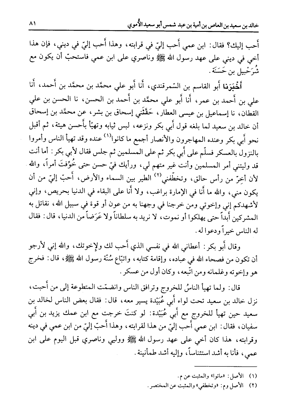 أحب إليك فقال ابن عمي أحب إلي في قرابته وهذا أحب إلي في ديني فإن هذا أخي في ديني على عهد رسول الله (صلى الله عليه وسلم) وناصري على ابن عمي فاستحب أن يكون مع شرحبيل بن حسنة أخبرنا أبو القاسم بن السمرقندي أنا أبو علي محمد بن محمد بن أحمد أنا علي بن أحمد بن عمر أنا أبو علي محمد بن أحمد بن الحسن نا الحسن بن علي القطان نا إسماعيل بن عيسى العطار حدثني إسحاق بن بشر عن محمد بن إسحاق أن خالد بن سعيد لما بلغه قول أبي بكر ونزعه لبس ثيابه وتهيأ بأحسن هيئة ثم أقبل نحو أبي بكر وعنده المهاجرون والأنصار أجمع ما كانوا (1) عنده وقد تهيأ الناس وأمروا بالنزول بالعسكر فسلم على أبي بكر ثم على المسلمين ثم جلس فقال لأبي بكر أما أنت قد وليتني أمر المسلمين وأنت غير متهم لي ورأيك في حسن حتى خوفت أمرا والله لأن أخر من رأس حالق وتخطفني (2) الطير بين السماء والأرض أحب إلي من أن يكون مني والله ما أنا في الإمارة براغب ولا أنا على البقاء في الدنيا بحريص وإني لأشهدكم إني وإخوتي ومن خرجنا في وجهنا به من عون أو قوة في سبيل الله نقاتل به المشركين أبدا حتى يهلكوا أو نموت لا نريد به سلطانا ولا عرضا من الدنيا قال فقال له الناس خيرا ودعوا له وقال أبو بكر أعطاني الله في نفسي الذي أحب لك ولأخوتك والله إني لأرجو أن تكون من فصحاء الله في عباده وإقامة كتابه واتباع سنة رسول الله (صلى الله عليه وسلم) قال فخرج هو وإخوته وغلمانه ومن اتبعه وكان أول من عسكر قال ولما تهيأ الناس للخروج وترافق الناس وانضمت المتطوعة إلى من أحبت نزل خالد بن وسيد تحت لواء أبي عبيدة يسير معه قال فقال بعض الناس لخالد بن سعيد حين تهيأ للخروج مع أبي عبيدة لو كنت خرجت مع ابن عمك يزيد بن أبي سفيان فقال ابن عمي أحب ألي من هذا لقرابته وهذا أحب إلي من أبي عمي في دينه وقرابته هذا كان أخي على عهد رسول الله (صلى الله عليه وسلم) ووليي وناصري قبل اليوم على ابن عمي فأنا به أشد استئناسا وإليه أشد طمأنينة