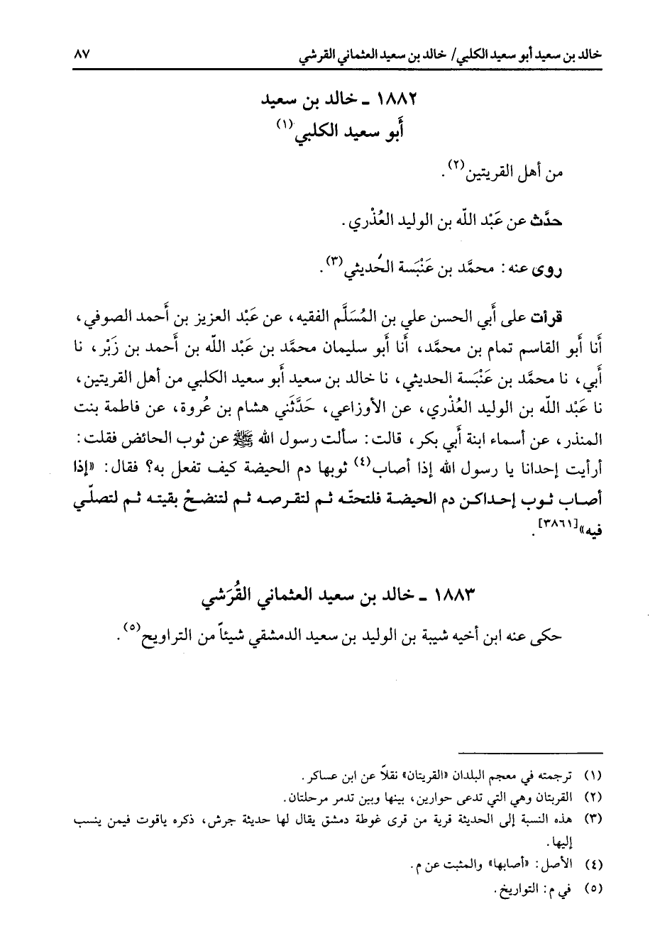 1883 - خالد بن سعيد العثماني القرشي حكى عنه ابن أخيه شيبة بن الوليد بن سعيد الدمشقي شيئا من التراويح (5)