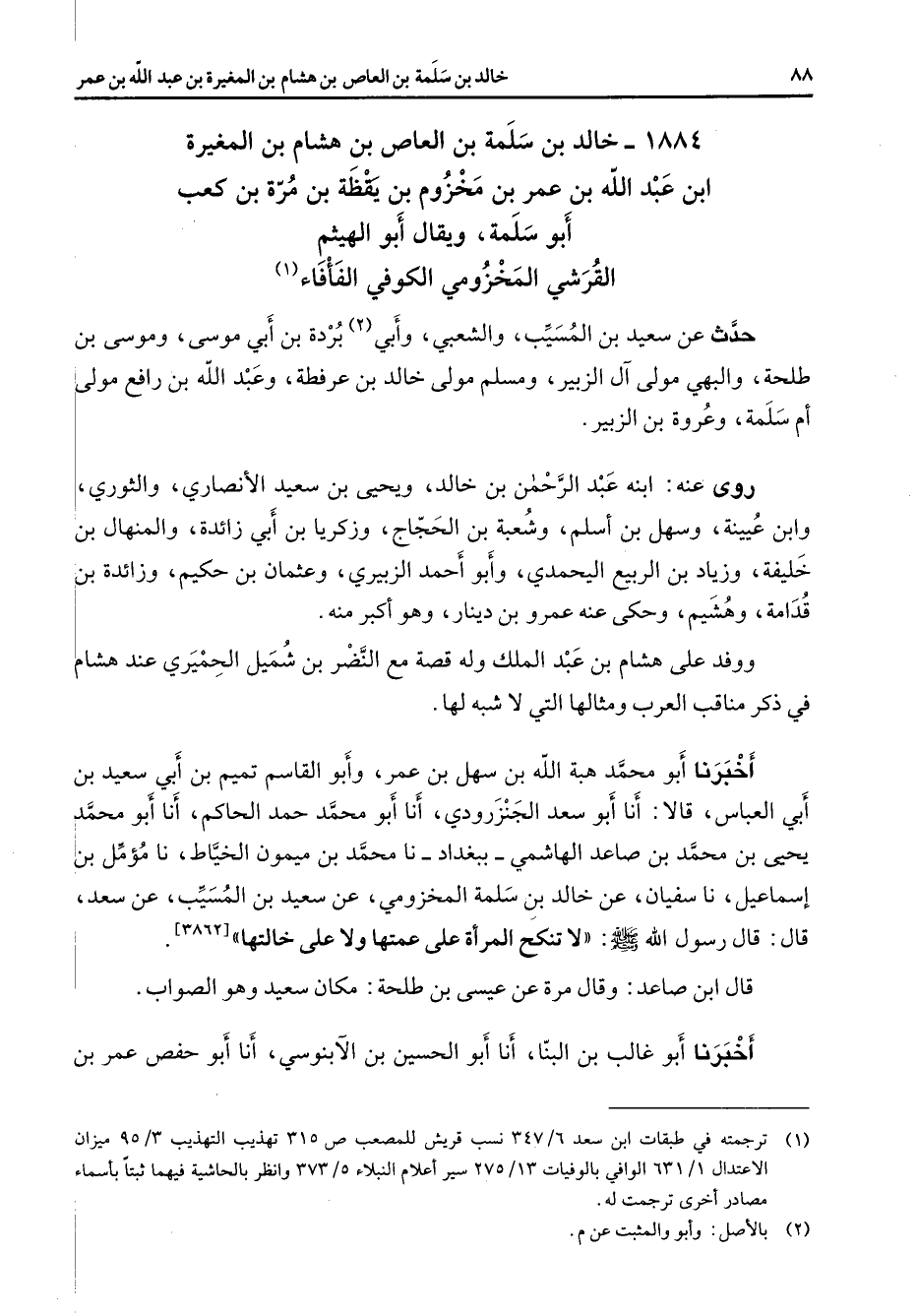 1884 - خالد بن سلمة بن العاص بن هشام بن المغيرة ابن عبد الله بن عمر بن مخزوم بن يقظة بن مرة بن كعب أبو سلمة ويقال أبو الهيثم القرشي المخزومي الكوفي الفأفاء (1) حدث عن سعيد بن المسيب والشعبي وأبي (2) بردة بن أبي موسى وموسى بن طلحة والبهي مولى آل الزبير ومسلم مولى خالد بن عرفطة وعبد الله بن رافع مولى أم سلمة وعروة بن الزبير روى عنه ابنه عبد الرحمن بن خالد ويحيى بن سعيد الأنصاري والثوري وابن عيينة وسهل بن أسلم وشعبة بن الحجاج وزكريا بن أبي زائدة والمنهال بن خليفة وزياد بن الربيع اليحمدي وأبو أحمد الزبيري وعثمان بن حكيم وزائدة بن قدامة وهشيم وحكى عنه عمرو بن دينار وهو أكبر منه ووفد على هشام بن عبد الملك وله قصة مع النضر بن شميل الحميري عند هشام في ذكر مناقب العرب ومثالها التي لا شبه لها أخبرنا أبو محمد هبة الله بن سهل بن عمر وأبو القاسم تميم بن أبي سعيد بن أبي العباس قالا أنا أبو سعد الجنزرودي أنا أبو محمد حمد الحاكم أنا أبو محمد يحيى بن محمد بن صاعد الهاشمي ببغداد نا محمد بن ميمون الخياط نا مؤمل بن إسماعيل نا سفيان عن خالد بن سلمة المخزومي عن سعيد بن المسيب عن سعد قال قال رسول الله (صلى الله عليه وسلم) لا تنكح المرأة على عمتها ولا على خالتها قال ابن صاعد وقال مرة عن عيسى بن طلحة مكان سعيد وهو الصواب أخبرنا أبو غالب بن البنا أنا أبو الحسين بن الآبنوسي أنا أبو حفص عمر بن