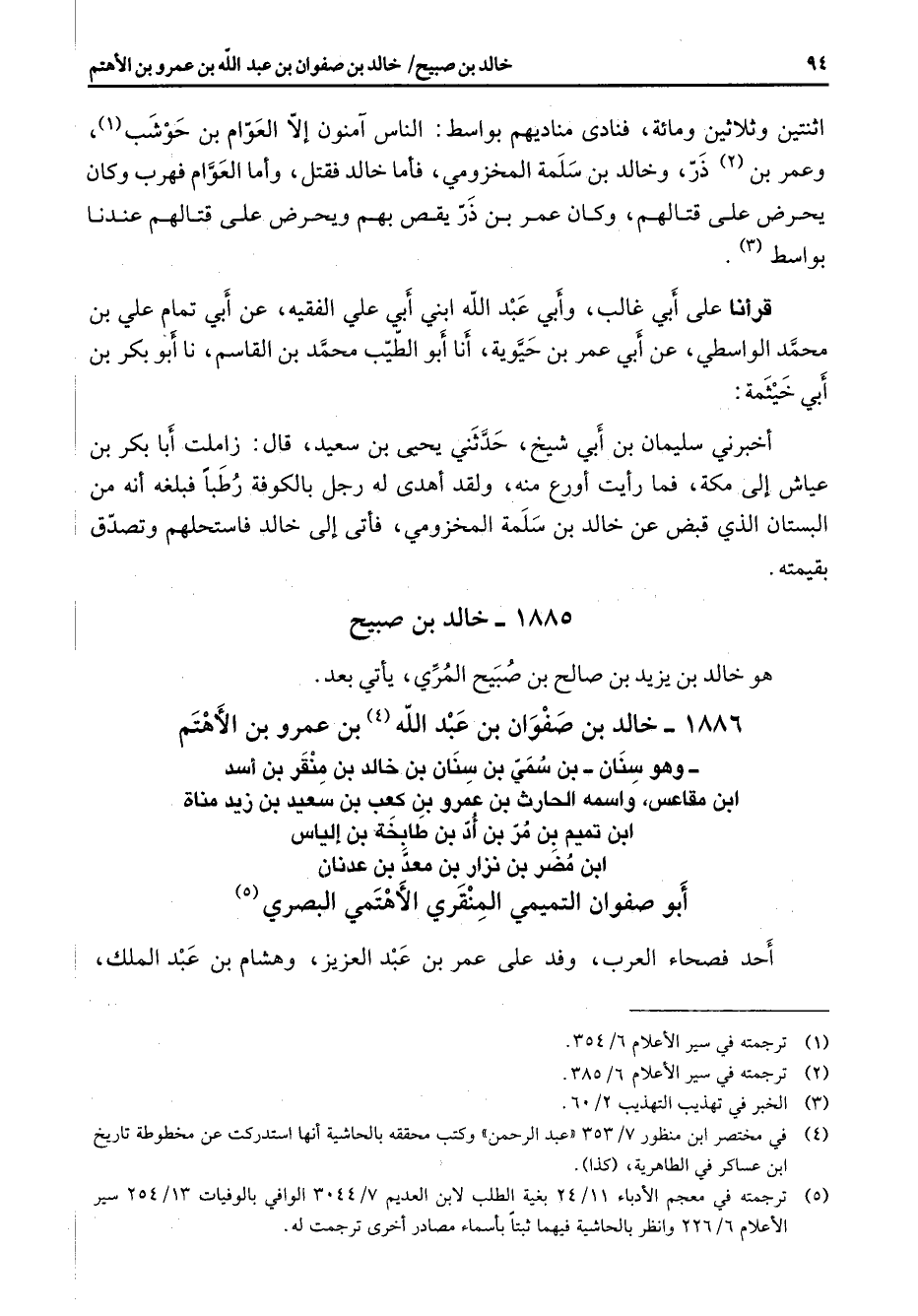 1886 - خالد بن صفوان بن عبد الله (4) بن عمرو بن الأهتم وهو سنان بن سمي بن سنان بن خالد بن منقر بن أسد ابن مقاعس واسمه الحارث بن عمرو بن كعب بن سعيد بن زيد مناة ابن تميم بن مر بن أد بن طابخة بن ح إلياس ابن مضر بن نزار بن معد بن عدنان أبو صفوان التميمي المنقري الأهتمي البصري (5) أحد فصحاء العرب وفد على عمر بن عبد العزيز وهشام بن عبد الملك