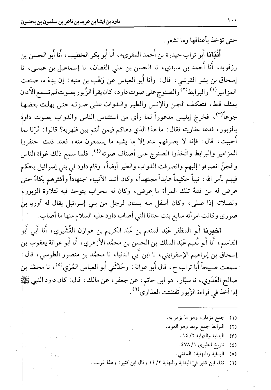 حتى تؤخذ بأعناقها وما تشعر أنبأنا أبو تراب حيدرة بن أحمد المقرئ أنا أبو بكر الخطيب أنا أبو الحسن بن رزقويه أنا أحمد بن سيدي نا الحسن بن علي القطان نا إسماعيل بن عيسى نا إسحاق بن بشر القرشي قال وأنا أبو العباس عن وهب بن منبه إن بدء ما صنعت المزامير (1) والبرابط والصنوج (2) على صوت داود كان يقرأ الزبور بصوت لم تسمع الآذان بمثله قط فتعكف الجن والإنس والطير والدواب على صوته حتى يهلك بعضها جوعا () 3 فخرج إبليس مذعورا لما رأى من استئناس الناس والدواب بصوت داود بالزبور فدعا عفاريته فقال ما هذا الذي دهاكم فيمن أنتم بين ظهريه قالوا مرنا بما أحببت قال فإنه لا يصرفهم عنه إلا ما يشبه ما يسمعون منه فعند ذلك احتفروا المزامير والبرابط واتخذوا الصنوج على أصناف صوته (4) فلما سمع ذلك غواة الناس والجن انصرفوا إليهم وانصرفت الدواب والطير أيضا وقام داود في بني إسرائيل يحكم فيهم بأمر الله نبيا حكيما عابدا مجتهدا وكان أشد الأنبياء اجتهادا وأكثرهم بكاء حتى عرض له من فتنة تلك المرأة ما عرض وكان له محراب يتوحد فيه لتلاوة الزبور ولصلاته إذا صلى وكان أسفل منه بستان لرجل من بني إسرائيل يقال له أوريا بن صوري وكانت امرأته سابع بنت حنانا التي أصاب داود عليه السلام منها ما أصاب أخبرنا أبو المظفر عبد المنعم بن عبد الكريم بن هوازن القشيري أنا أبي أبو القاسم أنا أبو نعيم عبد الملك بن الحسن بن محمد الأزهري أنا أبو عوانة يعقوب بن إسحاق بن إبراهيم الإسفرايني نا ابن أبي الدنيا نا محمد بن منصور الطوسي قال سمعت صبيحا أبا تراب قال أبو عوانة وحدثني أبو العباس المري (5) نا محمد بن صالح العدوي نا سيار هو ابن حاتم عن جعفر عن مالك قال كان داود النبي (صلى الله عليه وسلم) إذا أخذ في قراءة الزبور تفنقتت العذاري (6)