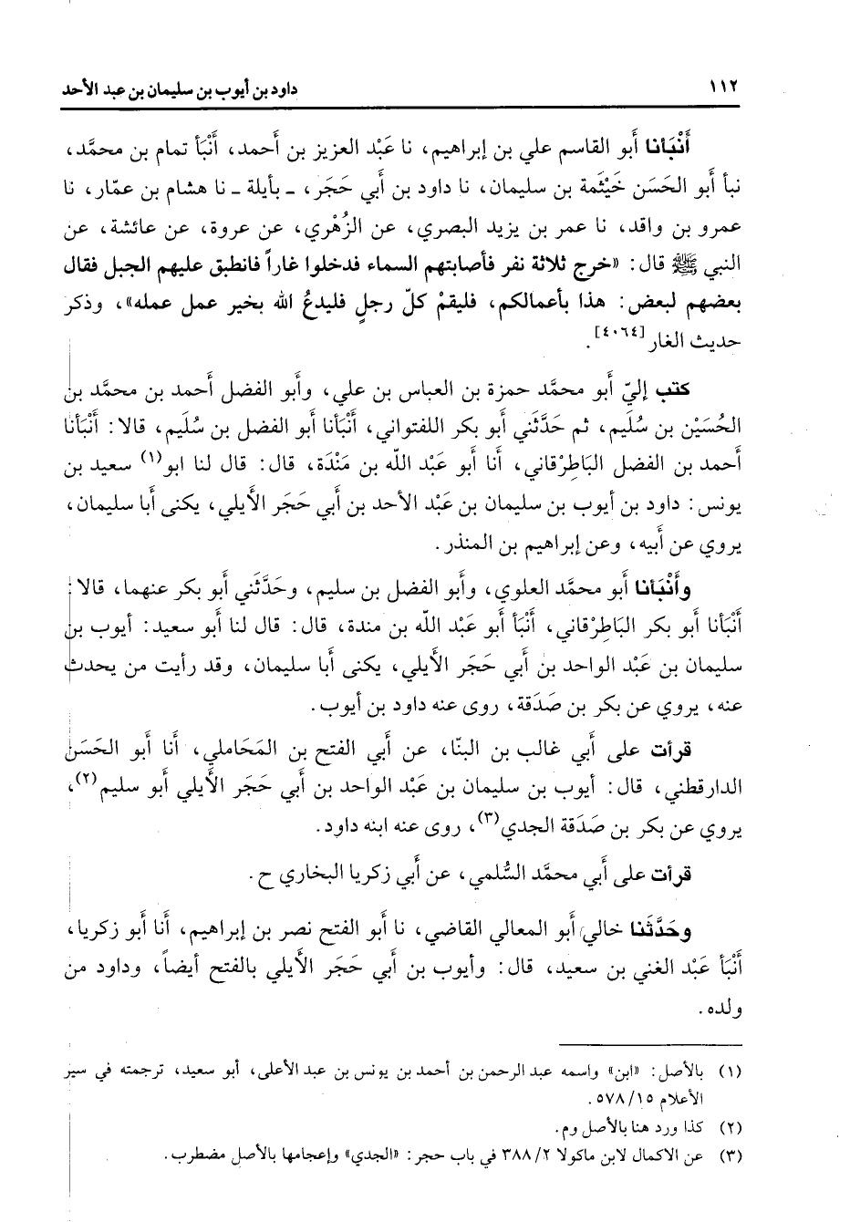 أنبأنا أبو القاسم علي بن إبراهيم نا عبد العزيز بن أحمد أنبأ تمام بن محمد نبأ أبو الحسن خيثمة بن سليمان نا داود بن أبي حجر بأيلة نا هشام بن عمار نا عمرو بن واقد نا عمر بن يزيد البصري عن الزهري عن عروة عن عائشة عن النبي (صلى الله عليه وسلم) قال خرج ثلاثة نفر فأصابتهم السماء فدخلوا غارا فانطبق عليهم الجبل فقال بعضهم لبعض هذا بأعمالكم فليقم كل رجل فليدع الله بخير عمل عمله وذكر حديث الغار كتب إلي أبو محمد حمزة بن العباس بن علي وأبو الفضل أحمد بن محمد بن الحسين بن سليم ثم حدثني أبو بكر اللفتواني أنبأنا أبو الفضل بن سليم قالا أنبأنا أحمد بن الفضل الباطرقاني أنا أبو عبد الله بن مندة قال قال لنا أبو (1) سعيد بن يونس داود بن أيوب بن سليمان بن عبد الأحد بن أبي حجر الأيلي يكنى أبا سليمان يروي عن أبيه وعن إبراهيم بن المنذر وأنبأنا أبو محمد العلوي وأبو الفضل بن سليم وحدثني أبو بكر عنهما قالا أنبأنا أبو بكر الباطرقاني أنبأ أبو عبد الله بن مندة قال قال لنا أبو سعيد أيوب بن سليمان بن عبد الواحد بن أبي حجر الأيلي يكنى أبا سليمان وقد رأيت من يحدث عنه يروى عن بكر بن صدقة روى عنه داود بن أيوب قرأت على أبي غالب بن البنا عن أبي الفتح بن المحاملي أنا أبو الحسن الدارقطني قال أيوب بن سليمان بن عبد الواحد بن أبي حجر الأيلي أبو سليم (2) يروي عن بكر بن صدقة الجدي (3) روى عنه ابنه داود قرأت على أبي محمد السلمي عن أبي زكريا البخاري وحدثنا خالي أبو المعالي القاضي نا أبو الفتح نصر بن إبراهيم أنا أبو زكريا أنبأ عبد الغني بن سعيد قال وأيوب بن أبي حجر الأيلي بالفتح أيضا وداود من ولده