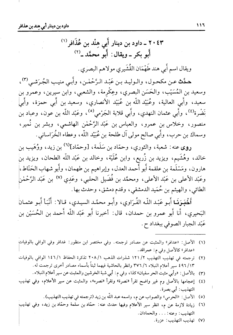 2043 - داود بن دينار أبي هند بن عذافر (1) أبو بكر ويقال أبو محمد (2) ويقال اسم أبي هند طهمان القشيري مولاهم البصري حدث عن مكحول والوليد بن عبد الرحمن وأبي منيب الجرشي (3) وسعيد بن المسيب والحسن البصري وعكرمة والشعبي وابن سيرين وعمرو بن سعيد وأبي العالية وعبيد الله بن عبيد الأنصاري وسعيد بن أبي حمزة وأبي نضرة (4) وأبي عثمان النهدي وأبي قلابة الجرمي (5) وعبد الله بن عون وعباد بن منصور وخلاس بن عمرو والعباس بن عبد الرحمن الهاشمي وبشر بن نمير وسماك بن حرب وأبي صالح مولى آل طلحة بن عبيد الله وعطاء الخراساني روى عنه شعبة والثوري وحماد بن سلمة وحماد (6) بن زيد ووهيب بن خالد وهشيم ويزيد بن زريع وابن علية وخالد بن عبد الله الطحان ويزيد بن هارون ومسلمة بن علقمة أبو أحمد العدل وإبراهيم بن طهمان وأبو شهاب الحناط وعبد الأعلى بن عبد الأعلى ومحمد بن فضيل الحلبي وعدي (7) بن عبد الرحمن الطائي والهيثم بن حميد الدمشقي وقدم دمشق وحدث بها أخبرنا أبو عبد الله الفراوي وأبو محمد السيدي قالا أنبأ أبو عثمان البحيري أنا أبو عمرو بن حمدان قال أخبرنا أبو عبد الله أحمد بن الحسين بن عبد الجبار الصوفي ببغداد
