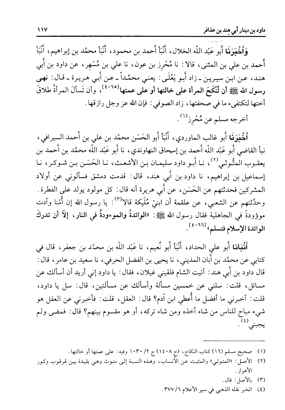وأخبرنا أبو عبد الله الخلال أنبأ أحمد بن محمود أنبأ محمد بن إبراهيم أنبأ أحمد بن علي بن المثنى قالا نا محرز بن عون نا علي بن مسهر عن داود بن أبي هند عن ابن سيرين زاد أبو يعلى يعني محمدا عن أبي هريرة قال نهى رسول الله (صلى الله عليه وسلم) أن تنكح المرأة على خالتها أو على عمتها وأن تسأل المرأة طلاق أختها لتكتفئ ما في صحفتها زاد الصوفي فإن الله عز وجل رازقها أخرجه مسلم عن محرز (1) أخبرنا أبو غالب الماوردي أنبأ أبو الحسن محمد بن علي بن أحمد السيرافي نبأ القاضي أبو عبد الله أحمد بن إسحاق النهاوندي نا أبو عبد الله محمد بن أحمد بن يعقوب المتوثي (2) نا أبو داود سليمان بن الأشعث نا الحسن بن شوكر نا إسماعيل بن إبراهيم نا داود بن أبي هند قال قدمت دمشق فسألوني عن أولاد المشركين فحدثتهم عن الحسن عن أبي هريرة أنه قال كل مولود يولد على الفطرة وحدثتهم عن الشعبي عن علقمة أن ابني مليكة قالا (3) يا رسول الله إن أمنا وأدت موؤودة في الجاهلية فقال رسول الله (صلى الله عليه وسلم) الوائدة والموءودة في النار إلا أن تدرك الوائدة الإسلام فتسلم أنبأنا أبو علي الحداد أنبأ أبو نعيم نا عبد الله بن محمد بن جعفر قال في كتابي عن محمد بن أبان المديني نا يحيى بن الفضل الحرفي نا سعيد بن عامر قال قال داود بن أبي هند أتيت الشام فلقيني غيلان فقال يا داود إني أريد أن أسألك عن مسائل قلت سلني عن خمسين مسألة وأسألك عن مسألتين قال سل يا داود قلت أخبرني ما أفضل ما أعطي ابن آدم قال العقل قلت فأخبرني عن العقل هو شئ مباح للناس من شاء أخذه ومن شاء تركه أو هو مقسوم بينهم قال فمضى ولم يجبني (3)