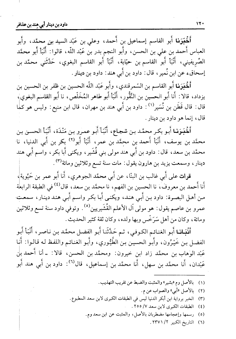 أخبرنا أبو القاسم إسماعيل بن أحمد وعلي بن عبد السيد بن محمد وأبو العباس أحمد بن علي بن الحسن وأبو النجم بدر بن عبد الله قالوا أنبأ أبو محمد الصريفيني أنبأ أبو القاسم بن حبابة أنبأ أبو القاسم البغوي حدثني محمد بن إسحاق عن ابن نمير قال داود بن أبي هند داود بن دينار أخبرنا أبو القاسم بن السمرقندي وأبو عبد الله الحسين بن ظفر بن الحسين بن يزداد قالا أنا أبو الحسين بن النقور أنبأ أبو طاهر المخلص نا أبو القاسم البغوي قال قال قطن بن نسير (1) داود بن أبي هند بن مهران قال ابن منيع وليس هو كما قال إنما هو داود بن دينار أخبرنا أبو بكر محمد بن شجاع أنبأ أبو عمرو بن مندة أنبأ الحسن بن محمد بن يوسف أنبأ أحمد بن محمد بن عمر أنبأ أبو (2) بكر بن أبي الدنيا نا محمد بن سعد قال داود بن أبي هند مولى بني قشير ويكنى أبا بكر واسم أبي هند دينار وسمعت يزيد بن هارون يقول مات سنة تسع وثلاثين ومائة قرأت على أبي غالب بن البنا عن أبي محمد الجوهري أنا أبو عمر بن حيوية أنا أحمد بن معروف نا الحسين بن الفهم نا محمد بن سعد قال (4) في الطبقة الرابعة من أهل البصرة داود بن أبي هند ويكنى أبا بكر واسم أبي هند دينار سمعت عمرو بن عاصم يقول هو مولى آل الأعلم القشيريين (5) وتوفي داود سنة تسع وثلاثين ومائة وكان من أهل سرخس وبها ولده وكان ثقة كثير الحديث أنبأنا أبو الغنائم الكوفي ثم حدثنا أبو الفضل محمد بن ناصر أنبأ أبو الفضل بن خيرون وأبو الحسين بن الطيوري وأبو الغنائم واللفظ له قالوا أنا عبد الوهاب بن محمد زاد ابن خيرون ومحمد بن الحسن قالا أنا أحمد بن عبدان أنا محمد بن سهل أنا محمد بن إسماعيل قال (6) داود بن أبي هند أبو