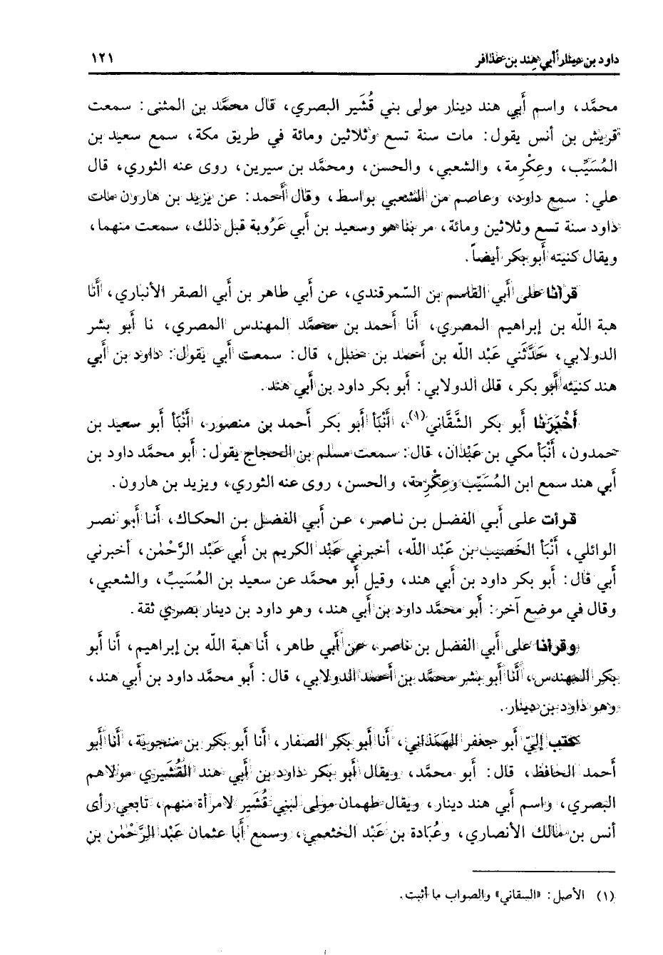 محمد واسم أبي هند دينار مولى بني قشير البصري قال محمد بن المثنى سمعت قريش بن أنس يقول مات سنة تسع وثلاثين ومائة في طريق مكة سمع سعيد بن المسيب وعكرمة والشعبي والحسن ومحمد بن سيرين روى عنه الثوري قال علي سمع داود وعاصم من الشعبي بواسط وقال أحمد عن يزيد بن هارون مات داود سنة تسع وثلاثين ومائة مر بنا هو وسعيد بن أبي عروبة قبل ذلك سمعت منهما ويقال كنيته أبو بكر أيضا قرأنا على أبي القاسم بن السمرقندي عن أبي طاهر بن أبي الصقر الأنباري أنا هبة الله بن إبراهيم المصري أنا أحمد بن محمد المهندس المصري نا أبو بشر الدولابي حدثني عبد الله بن أحمد بن حنبل قال سمعت أبي يقول داود بن أبي هند كنيته أبو بكر قال الدولابي أبو بكر داود بن أبي هند أخبرنا أبو بكر الشقاني (1) أنبأ أبو بكر أحمد بن منصور أنبأ أبو سعيد بن حمدون أنبأ مكي بن عبدان قال سمعت مسلم بن الحجاج يقول أبو محمد داود بن أبي هند سمع ابن المسيب وعكرمة والحسن روى عنه الثوري ويزيد بن هارون قرأت على أبي الفضل بن ناصر عن أبي الفضل بن الحكاك أنا أبو نصر الوائلي أنبأ الخصيب بن عبد الله أخبرني عبد الكريم بن أبي عبد الرحمن أخبرني أبي قال أبو بكر داود بن أبي هند وقيل أبو محمد عن سعيد بن المسيب والشعبي وقال في موضع آخر أبو محمد داود بن أبي هند وهو داود بن دينار بصري ثقة وقرأنا على أبي الفضل بن ناصر عن أبي طاهر أنا هبة الله بن إبراهيم أنا أبو بكر المهندس أنا أبو بشر محمد بن أحمد الدولابي قال أبو محمد داود بن أبي هند وهو داود بن دينار كتب إلي أبو جعفر الهمذاني أنا أبو بكر الصفار أنا أبو بكر بن منجوية أنا أبو أحمد الحافظ قال أبو محمد ويقال أبو بكر داود بن أبي هند القشيري مولاهم البصري واسم أبي هند دينار ويقال طهمان مولى لبني قشير لامرأة منهم تابعي رأى أنس بن مالك الأنصاري وعبادة بن عبد الخثعمي وسمع أبا عثمان عبد الرحمن بن