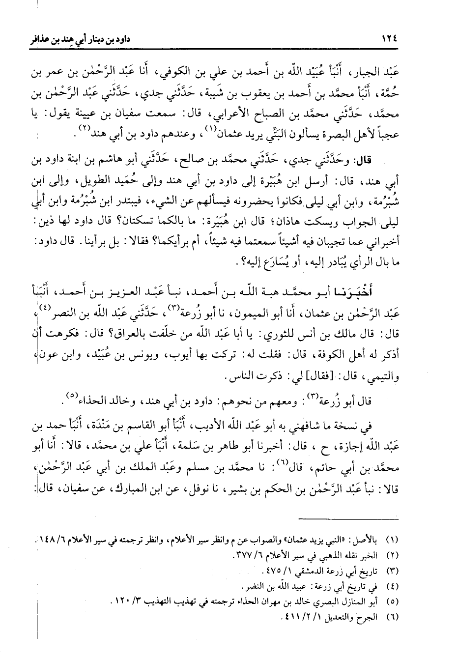 عبد الجبار أنبأ عبيد الله بن أحمد بن علي بن الكوفي أنا عبد الرحمن بن عمر بن حمة أنبأ محمد بن أحمد بن يعقوب بن شيبة حدثني جدي حدثني عبد الرحمن بن محمد حدثني محمد بن الصباح الأعرابي قال سمعت سفيان بن عيينة يقول يا عجبا لأهل البصرة يسألون البتي يريد عثمان (1) وعندهم داود بن أبي هند (2) قال وحدثني جدي حدثني محمد بن صالح حدثني أبو هاشم بن ابنة داود بن أبي هند قال أرسل ابن هبيرة إلى داود بن أبي هند وإلى حميد الطويل وإلى ابن شبرمة وابن أبي ليلى فكانوا يحضرونه فيسألهم عن الشئ فيبتدر ابن شبرمة وابن أبي ليلى الجواب ويسكت هاذان قال ابن هبيرة ما بالكما تسكتان قال داود لها ذين أخبراني عما تجيبان فيه أشيئا سمعتما فيه شيئا أم برأيكما فقالا بل برأينا قال داود ما بال الرأي يبادر إليه أو يسارع إليه أخبرنا أبو محمد هبة الله بن أحمد نبأ عبد العزيز بن أحمد أنبا عبد الرحمن بن عثمان أنا أبو الميمون نا أبو زرعة (3) حدثني عبد الله بن النصر (4) قال قال مالك بن أنس للثوري يا أبا عبد الله من خلفت بالعراق قال فكرهت أن أذكر له أهل الكوفة قال فقلت له تركت بها أيوب ويونس بن عبيد وابن عون والتيمي قال فقال لي ذكرت الناس قال أبو زرعة (3) ومعهم من نحوهم داود بن أبي هند وخالد الحذاء (4) في نسخة ما شافهني به أبو عبد الله الأديب أنبأ أبو القاسم بن مندة أنبأ حمد بن عبد الله إجازة قال أخبرنا أبو طاهر بن سلمة أنبأ علي بن محمد قالا أنا أبو محمد بن أبي حاتم قال نا محمد بن مسلم وعبد الملك بن أبي عبد الرحمن قالا نبأ عبد الرحمن بن الحكم بن بشير نا نوفل عن ابن المبارك عن سفيان قال