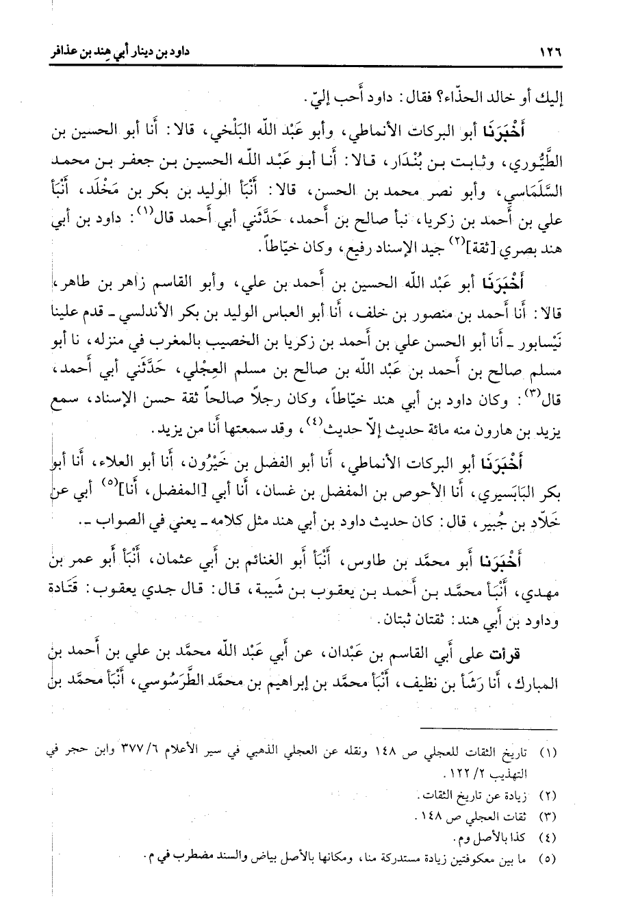 إليك أو خالد الحذاء فقال داود أحب إلي أخبرنا أبو البركات الأنماطي وأبو عبد الله البلخي قالا أنا أبو الحسين بن الطيوري وثابت بن بندار قالا أنا أبو عبد الله الحسين بن جعفر بن محمد السلماسي وأبو نصر محمد بن الحسن قالا أنبأ الوليد بن بكر بن مخلد أنبأ علي بن أحمد بن زكريا نبأ صالح بن أحمد حدثني أبي أحمد قال (1) داود بن أبي هند بصري ثقة (2) جيد الإسناد رفيع وكان خياطا أخبرنا أبو عبد الله الحسين بن أحمد بن علي وأبو القاسم زاهر بن طاهر قالا أنا أحمد بن منصور بن خلف أنا أبو العباس الوليد بن بكر الأندلسي قدم علينا نيسابور أنا أبو الحسن علي بن أحمد بن زكريا بن الخصيب بالمغرب في منزله نا أبو مسلم صالح بن أحمد بن عبد الله بن صالح بن مسلم العجلي حدثني أبي أحمد قال (3) وكان داود بن أبي هند خياطا وكان رجلا صالحا ثقة حسن الإسناد سمع يزيد بن هارون منه مائة حديث إلا حديث (4) وقد سمعتها أنا من يزيد أخبرنا أبو البركات الأنماطي أنا أبو الفضل بن خيرون أنا أبو العلاء أنا أبو بكر البابسيري أنا الأحوص بن المفضل بن غسان أنا أبي المفضل أنا (5) أبي عن خلاد بن جبير قال كان حديث داود بن أبي هند مثل كلامه يعني في الصواب أخبرنا أبو محمد بن طاوس أنبأ أبو الغنائم بن أبي عثمان أنبا أبو عمر بن مهدي أنبأ محمد بن أحمد بن يعقوب بن شيبة قال قال جدي يعقوب قتادة وداود بن أبي هند ثقتان ثبتان قرأت على أبي القاسم بن عبدان عن أبي عبد الله محمد بن علي بن أحمد بن المبارك أنا رشأ بن نظيف أنبأ محمد بن إبراهيم بن محمد الطرسوسي أنبأ محمد بن محمد بن