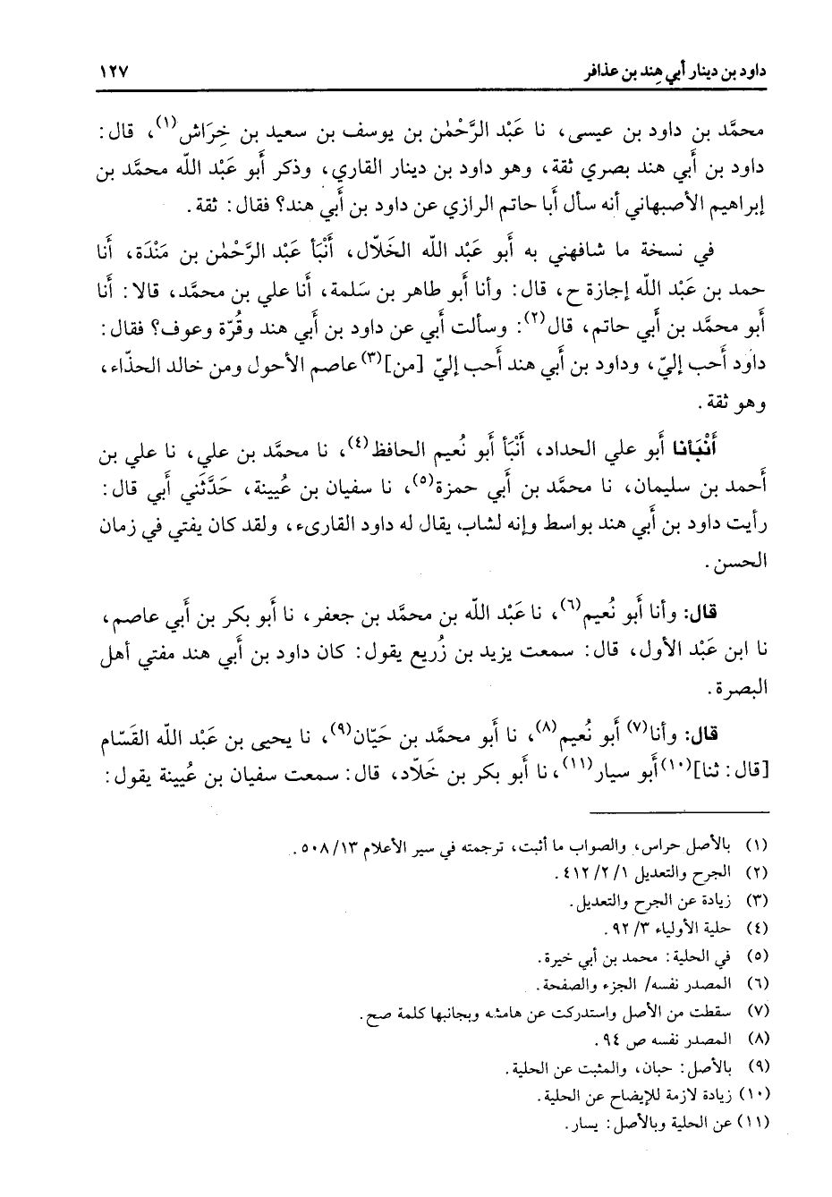 داود بن عيسى نا عبد الرحمن بن يوسف بن سعيد بن خراش (1) قال داود بن أبي هند بصري ثقة وهو داود بن دينار القاري وذكر أبو عبد الله محمد بن إبراهيم الأصبهاني أنه سأل أبا حاتم الرازي عن داود بن أبي هند فقال ثقة في نسخة ما شافهني به أبو عبد الله الخلال أنبأ عبد الرحمن بن مندة أنا حمد بن عبد الله إجازة قال وأنا أبو طاهر بن سلمة أنا علي بن محمد قالا أنا أبو محمد بن أبي حاتم قال (2) وسألت أبي عن داود بن أبي هند وقرة وعوف فقال داود أحب إلي وداود بن أبي هند أحب إلي من (3) عاصم الأحول ومن خالد الحذاء وهو ثقة أنبأنا أبو علي الحداد أنبأ أبو نعيم الحافظ (4) نا محمد بن علي نا علي بن أحمد بن سليمان نا محمد بن أبي حمزة (5) نا سفيان بن عيينة حدثني أبي قال رأيت داود بن أبي هند بواسط وإنه لشاب يقال له داود القارئ ولقد كان يفتي في زمان الحسن قال وأنا أبو نعيم (6) نا عبد الله بن محمد بن جعفر نا أبو بكر بن أبي عاصم نا ابن عبد الأول قال سمعت يزيد بن زريع يقول كان داود بن أبي هند مفتي أهل البصرة قال وأنا (7) أبو نعيم (8) نا أبو محمد بن حيان (9) نا يحيى بن عبد الله القسام قال ثنا (10) أبو سيار (11) نا أبو بكر بن خلاد قال سمعت سفيان بن عيينة يقول
