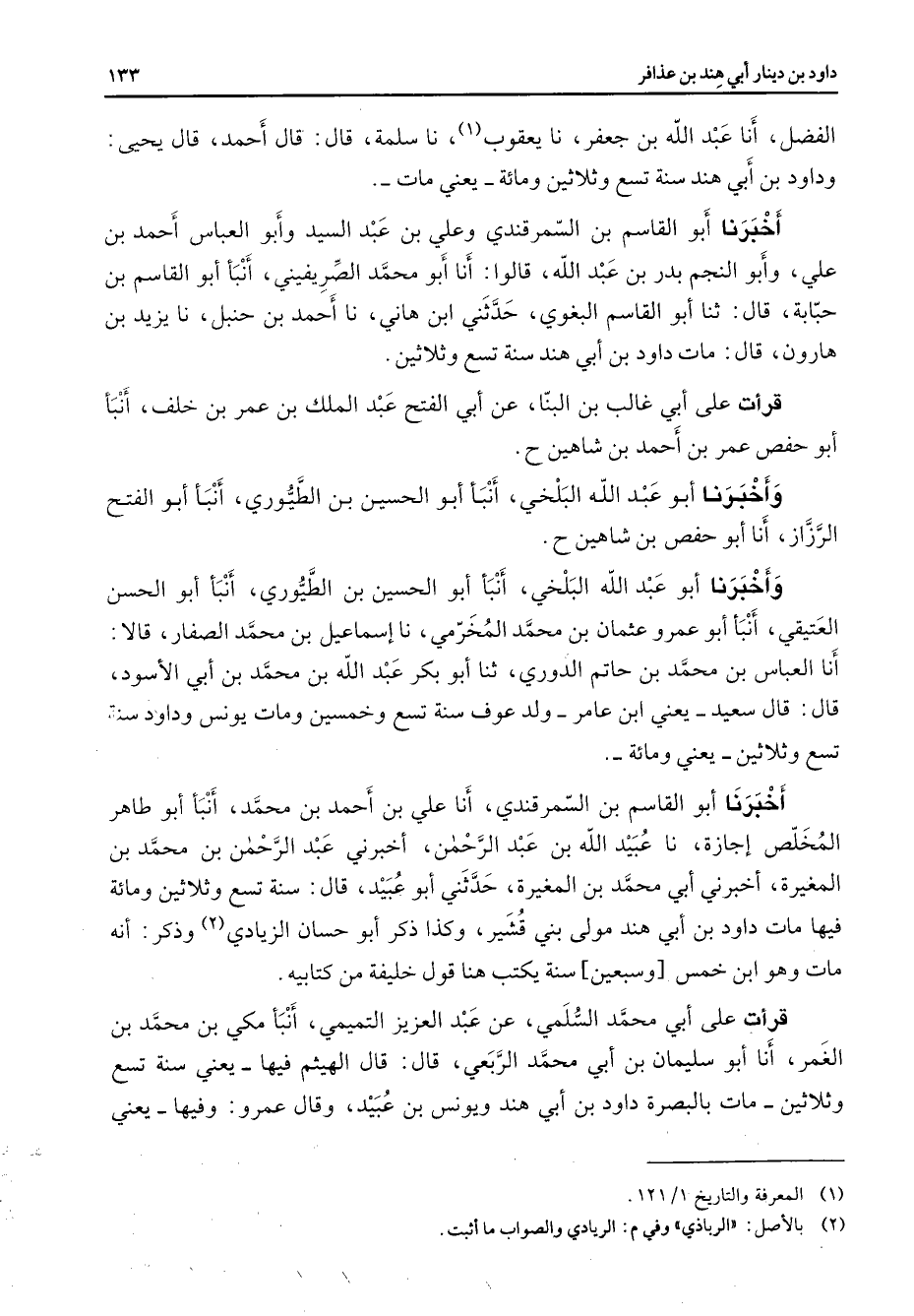 الفضل أنا عبد الله بن جعفر نا يعقوب (1) نا سلمة قال قال أحمد قال يحيى وداود بن أبي هند سنة تسع وثلاثين ومائة يعني مات أخبرنا أبو القاسم بن السمرقندي وعلي بن عبد السيد وأبو العباس أحمد بن علي وأبو النجم بدر بن عبد الله قالوا أنا أبو محمد الصريفيني أنبأ أبو القاسم بن حبابة قال ثنا أبو القاسم البغوي حدثني ابن هاني نا أحمد بن حنبل نا يزيد بن هارون قال مات داود بن أبي هند سنة تسع وثلاثين قرأت على أبي غالب بن البنا عن أبي الفتح عبد الملك بن عمر بن خلف أنبأ أبو حفص عمر بن أحمد بن شاهين وأخبرنا أبو عبد الله البلخي أنبأ أبو الحسين بن الطيوري أنبأ أبو الفتح الرزاز أنا أبو حفص بن شاهين وأخبرنا أبو عبد الله البلخي أنبأ أبو الحسين بن الطيوري أنبأ أبو الحسن العتيقي أنبأ أبو عمرو عثمان بن محمد المخرمي نا إسماعيل بن محمد الصفار قالا أنا العباس بن محمد بن حاتم الدوري ثنا أبو بكر عبد الله بن محمد بن أبي الأسود قال قال سعيد يعني ابن عامر ولد عوف سنة تسع وخمسين ومات يونس وداود سنة تسع وثلاثين يعني ومائة أخبرنا أبو القاسم بن السمرقندي أنا علي بن أحمد بن محمد أنبأ أبو طاهر المخلص إجازة نا عبيد الله بن عبد الرحمن أخبرني عبد الرحمن بن محمد بن المغيرة أخبرني أبي محمد بن المغيرة حدثني أبو عبيد قال سنة تسع وثلاثين ومائة فيها مات داود بن أبي هند مولى بني قشير وكذا ذكر أبو حسان الزيادي (2) وذكر أنه مات وهو ابن خمس وسبعين سنة يكتب هنا قول خليفة من كتابيه قرأت على أبي محمد السلمي عن عبد العزيز التميمي أنبأ مكي بن محمد بن الغمر أنا أبو سليمان بن أبي محمد الربعي قال قال الهيثم فيها يعني سنة تسع وثلاثين مات بالبصرة داود بن أبي هند ويونس بن عبيد وقال عمرو وفيها يعني