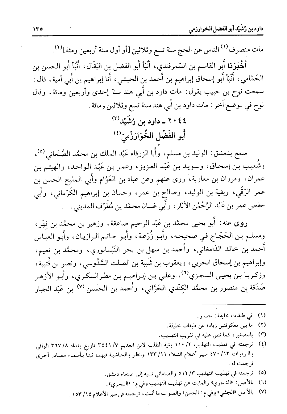 2044 - داود بن رشيد (3) أبو الفضل الخوارزمي (4) سمع بدمشق الوليد بن مسلم وأبا الزرقاء عبد الملك بن محمد الصنعاني (5) وشعيب بن إسحاق وسويد بن عبد العزيز وعمر بن عبد الواحد والهيثم بن عمران ومروان بن معاوية روى عنهم وعن عباد بن العوام وأبي المليح الحسن بن عمر الرقي وبقية بن الوليد وصالح بن عمر وحسان بن إبراهيم الكرماني وأبي حفص عمر بن عبد الرحمن الأبار وأبي غسان محمد بن مطرف المديني روى عنه أبو يحيى محمد بن عبد الرحيم صاعقة وزهير بن محمد بن فهر ومسلم بن الحجاج في صحيحه وأبو زرعة وأبو حاتم الرازيان وأبو العباس أحمد بن خالد الدامغاني وأحمد بن سهل بن بحر النيسابوري ومحمد بن نعيم وإبراهيم بن إسحاق الحربي ويعقوب بن شيبة بن الصلت السدوسي ونصر بن قتيبة وزكريا بن يحيى السجزي (6) وعلي بن إبراهيم بن مطر السكري وأبو الأزهر صدقة بن منصور بن محمد الكندي الحراني وأحمد بن الحسين (7) بن عبد الجبار
