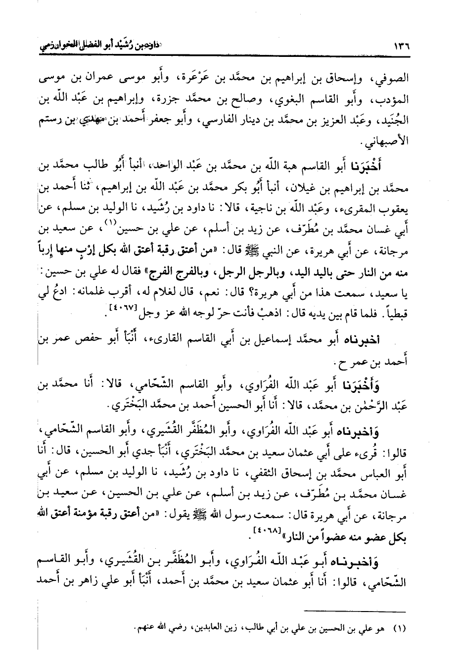 الصوفي وإسحاق بن إبراهيم بن محمد بن عرعرة وأبو موسى عمران بن موسى المؤدب وأبو القاسم البغوي وصالح بن محمد جزرة وإبراهيم بن عبد الله بن الجنيد وعبد العزيز بن محمد بن دينار الفارسي وأبو جعفر أحمد بن مهدي بن رستم الأصبهاني أخبرنا أبو القاسم هبة الله بن محمد بن عبد الواحد أنبأ أبو طالب محمد بن محمد بن إبراهيم بن غيلان أنبأ أبو بكر محمد بن عبد الله بن إبراهيم ثنا أحمد بن يعقوب المقرئ وعبد الله بن ناجية قالا نا داود بن رشيد نا الوليد بن مسلم عن أبي غسان محمد بن مطرف عن زيد بن أسلم عن علي بن حسين (1) عن سعيد بن مرجانة عن أبي هريرة عن النبي (صلى الله عليه وسلم) قال من أعتق رقبة أعتق الله بكل إرب منها إربا منه من النار حتى باليد اليد وبالرجل الرجل وبالفرج الفرج فقال له علي بن حسين يا سعيد سمعت هذا من أبي هريرة قال نعم قال لغلام له أقرب غلمانه ادع لي قبطيا فلما قام بين يديه قال اذهب فأنت حر لوجه الله عز وجل أخبرناه أبو محمد إسماعيل بن أبي القاسم القارئ أنبأ أبو حفص عمر بن أحمد بن عمر وأخبرنا أبو عبد الله الفراوي وأبو القاسم الشحامي قالا أنا محمد بن عبد الرحمن بن محمد قالا أنا أبو الحسين أحمد بن محمد البختري وأخبرناه أبو عبد الله الفراوي وأبو المظفر القشيري وأبو القاسم الشحامي قالوا قرئ على أبي عثمان سعيد بن محمد البختري أنبأ جدي أبو الحسين قال أن أبو العباس محمد بن إسحاق الثقفي نا داود بن رشيد نا الوليد بن مسلم عن أبي غسان محمد بن مطرف عن زيد بن أسلم عن علي بن الحسين عن سعيد بن مرجانة عن أبي هريرة قال سمعت رسول الله (صلى الله عليه وسلم) يقول من أعتق رقبة مؤمنة أعتق الله بكل عضو منه عضوا من النار وأخبرناه أبو عبد الله الفراوي وأبو المظفر بن القشيري وأبو القاسم الشحامي قالوا أنا أبو عثمان سعيد بن محمد بن أحمد أنبأ أبو علي زاهر بن أحمد