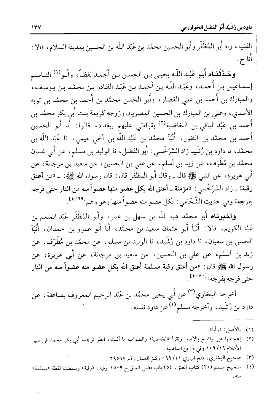 الفقيه زاد أبو المظفر وأبو الحسين محمد بن عبد الله بن الحسين بمدينة السلام قالا أنا وحدثناه أبو عبد الله يحيى بن الحسن بن أحمد لفظا وأبو (1) القاسم إسماعيل بن أحمد وعبد الله بن أحمد بن عبد القادر بن محمد بن يوسف والمبارك بن أحمد بن علي القصار وأبو الحسن محمد بن أحمد بن محمد بن توبة الأسدي وعلي بن المبارك بن الحسين المصريان وزوجه كريمة بنت أبي بكر محمد بن أحمد بن عبد الباقي بن الخاضبة بقراءتي عليهم ببغداد قالوا أنا أبو الحسين أحمد بن محمد بن النقور أنبأ محمد بن عبد الله بن أخي ميمي نا عبد الله بن محمد نا داود بن رشيد زاد السرخسي أبو الفضل نا الوليد بن مسلم عن أبي غسان محمد بن مطرف عن زيد بن أسلم عن علي بن الحسين عن سعيد بن مرجانه عن أبي هريرة عن النبي (صلى الله عليه وسلم) قال وقال أبو المظفر قال قال رسول الله (صلى الله عليه وسلم) من أعتق رقبة زاد السرخسي مؤمنة أعتق الله بكل عضو منها عضوا منه من النار حتى فرجه بفرجه وفي حديث الشحامي بكل عضو منه عضوا منها وهو وهم وأخبرناه أبو محمد هبة الله بن سهل بن عمر وأبو المظفر عبد المنعم بن عبد الكريم قالا أنبأ أبو عثمان سعيد بن محمد أنا أبو عمرو بن حمدان أنبأ الحسن بن سفيان نا داود بن رشيد نا الوليد بن مسلم عن محمد بن مطرف عن زيد بن أسلم عن علي بن الحسين عن سعيد بن مرجانة عن أبي هريرة عن رسول الله (صلى الله عليه وسلم) قال من أعتق رقبة مسلمة أعتق الله بكل عضو منه عضوا منه من النار حتى فرجه بفرجه أخرجه البخاري (3) عن أبي يحيى بن محمد بن عبد الرحيم المعروف بصاعقة عن داود بن رشيد وأخرجه مسلم (4) عن داود نفسه