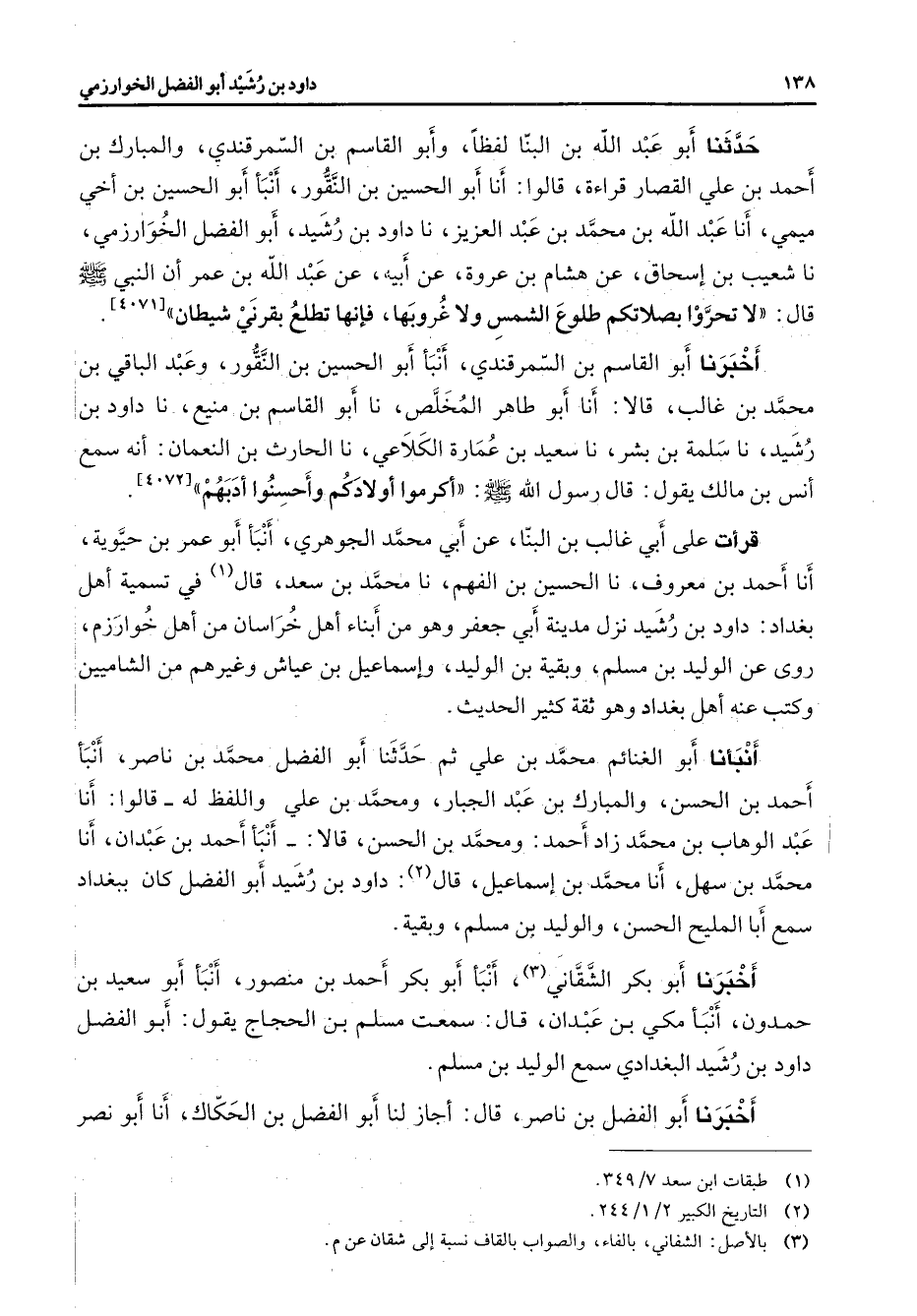 حدثنا أبو عبد الله بن البنا لفظا وأبو القاسم بن السمرقندي والمبارك بن أحمد بن علي القصار قراءة قالوا أنا أبو الحسين بن النقور أنبأ أبو الحسين بن أخي ميمي أنا عبد الله بن محمد بن عبد العزيز نا داود بن رشيد أبو الفضل الخوارزمي نا شعيب بن إسحاق عن هشام بن عروة عن أبيه عن عبد الله بن عمر أن النبي (صلى الله عليه وسلم) قال لا تحروا بصلاتكم طلوع الشمس ولا غروبها فإنها تطلع بقرني شيطان أخبرنا أبو القاسم بن السمرقندي أنبأ أبو الحسين بن النقور وعبد الباقي بن محمد بن غالب قالا أنا أبو طاهر المخلص نا أبو القاسم بن منيع نا داود بن رشيد نا سلمة بن بشر نا سعيد بن عمارة الكلاعي نا الحارث بن النعمان أنه سمع أنس بن مالك يقول قال رسول الله (صلى الله عليه وسلم) أكرموا أولادكم وأحسنوا أدبهم قرأت على أبي غالب بن البنا عن أبي محمد الجوهري أنبأ أبو عمر بن حيوية أنا أحمد بن معروف نا الحسين بن الفهم نا محمد بن سعد قال (1) في تسمية أهل بغداد داود بن رشيد نزل مدينة أبي جعفر وهو من أبناء أهل خراسان من أهل خوارزم روى عن الوليد بن مسلم وبقية بن الوليد وإسماعيل بن عياش وغيرهم من الشاميين وكتب عنه أهل بغداد وهو ثقة كثير الحديث أنبأنا أبو الغنائم محمد بن علي ثم حدثنا أبو الفضل محمد بن ناصر أنبأ أحمد بن الحسن والمبارك بن عبد الجبار ومحمد بن علي واللفظ له قالوا أنا عبد الوهاب بن محمد زاد أحمد ومحمد بن الحسن قالا أنبأ أحمد بن عبدان أنا محمد بن سهل أنا محمد بن إسماعيل قال (2) داود بن رشيد أبو الفضل كان ببغداد سمع أبا المليح الحسن والوليد بن مسلم وبقية أخبرنا أبو بكر الشقاني (3) أنبأ أبو بكر أحمد بن منصور أنبأ أبو سعيد بن حمدون أنبأ مكي بن عبدان قال سمعت مسلم بن الحجاج يقول أبو الفضل داود بن رشيد البغدادي سمع الوليد بن مسلم أخبرنا أبو الفضل بن ناصر قال أجاز لنا أبو الفضل بن الحكاك أنا أبو نصر