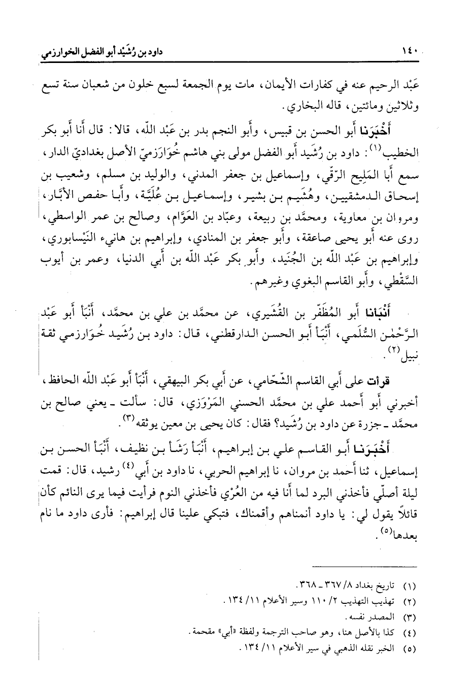 عبد الرحيم عنه في كفارات الأيمان مات يوم الجمعة لسبع خلون من شعبان سنة تسع وثلاثين ومائتين قاله البخاري أخبرنا أبو الحسن بن قبيس وأبو النجم بدر بن عبد الله قالا قال أنا أبو بكر الخطيب (1) داود بن رشيد أبو الفضل مولى بني هاشم خوارزمي الأصل بغدادي الدار سمع أبا المليح الرقي وإسماعيل بن جعفر المدني والوليد بن مسلم وشعيب بن إسحاق الدمشقيين وهشيم بن بشير وإسماعيل بن علية وأبا حفص الأبار ومروان بن معاوية ومحمد بن ربيعة وعباد بن العوام وصالح بن عمر الواسطي روى عنه أبو يحيى صاعقة وأبو جعفر بن المنادي وإبراهيم بن هانئ النيسابوري وإبراهيم بن عبد الله بن الجنيد وأبو بكر عبد الله بن أبي الدنيا وعمر بن أيوب السقطي وأبو القاسم البغوي وغيرهم أنبأنا أبو المظفر بن القشيري عن محمد بن علي بن محمد أنبأ أبو عبد الرحمن السلمي أنبأ أبو الحسن الدارقطني قال داود بن رشيد خوارزمي ثقة نبيل (2) قرأت على أبي القاسم الشحامي عن أبي بكر البيهقي أنبأ أبو عبد الله الحافظ أخبرني أبو أحمد علي بن محمد الحسني المروزي قال سألت يعني صالح بن محمد جزرة عن داود بن رشيد فقال كان يحيى بن معين يوثقه (3) أخبرنا أبو القاسم علي بن إبراهيم أنبأ رشأ بن نظيف أنبأ الحسن بن إسماعيل ثنا أحمد بن مروان نا إبراهيم الحربي نا داود بن أبي (4) رشيد قال قمت ليلة أصلي فأخذني البرد لما أنا فيه من العري فأخذني النوم فرأيت فيما يرى النائم كأن قائلا يقول لي يا داود أنمناهم وأقمناك فتبكي علينا قال إبراهيم فأرى داود ما نام بعدها (5)