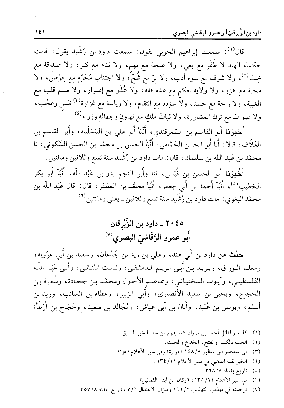 قال (1) سمعت إبراهيم الحربي يقول سمعت داود بن رشيد يقول قالت حكماء الهند لا ظفر مع بغي ولا صحة مع نهم ولا ثناء مع كبر ولا صداقة مع خب (2) ولا شرف مع سوء أدب ولا بر مع شح ولا اجتناب محرم مع حرص ولا محبة مع هزو ولا ولاية حكم مع عدم فقه ولا عذر مع إصرار ولا سلم قلب مع الغيبة ولا راحة مع حسد ولا سؤدد مع انتقام ولا رياسة مع غزارة (3) نفس وعجب ولا صواب مع ترك المشاورة ولا ثبات ملك مع تهاون وجهالة وزراء (4) أخبرنا أبو القاسم بن السمرقندي أنبأ أبو علي بن المسلمة وأبو القاسم بن العلاف قالا أنا أبو الحسن الحمامي أنبأ الحسن بن محمد بن الحسن السكوني نا محمد بن عبد الله بن سليمان قال مات داود بن رشيد سنة تسع وثلاثين ومائتين أخبرنا أبو الحسن بن قبيس ثنا وأبو النجم بدر بن عبد الله أنبأ أبو بكر الخطيب أنبأ أحمد بن أبي جعفر أنبأ محمد بن المظفر قال قال عبد الله بن محمد البغوي مات داود بن رشيد سنة تسع وثلاثين يعني ومائتين (6)